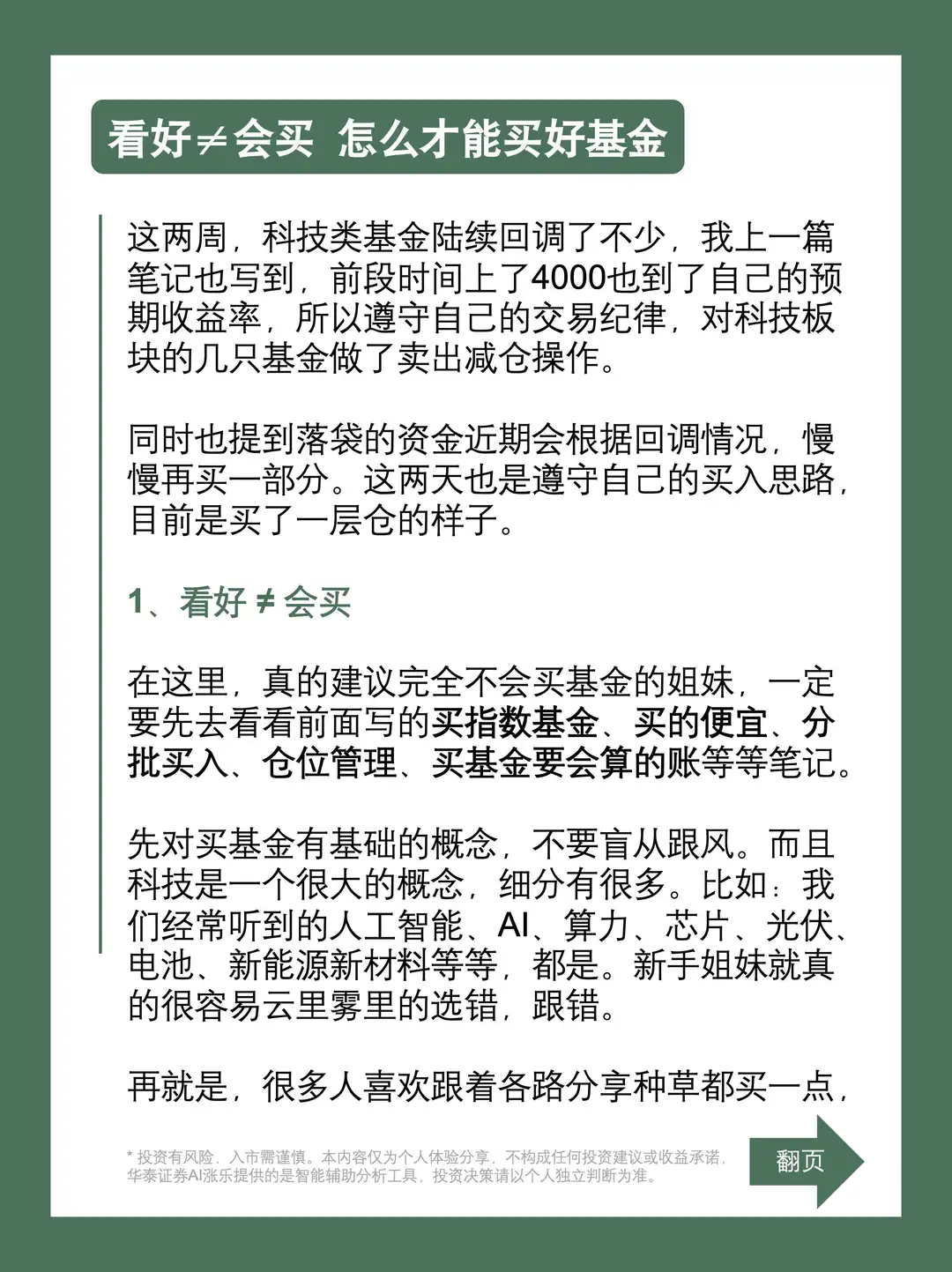 真心建议完全不会买基金的姐妹,一定要先去看前面写的分批买入、仓位管理、买基金要会算的账等笔记,先对买基金有概念。科技是一个很大的概念,细分很多。我们经常听到的人工智能、AI、算力、芯片、新能源新材料都是,新手姐妹很容易云里雾里选错跟错。再就是,很多人喜欢跟着各路分享种草都买一点,买基金就跟开超市一样,几十只在手。