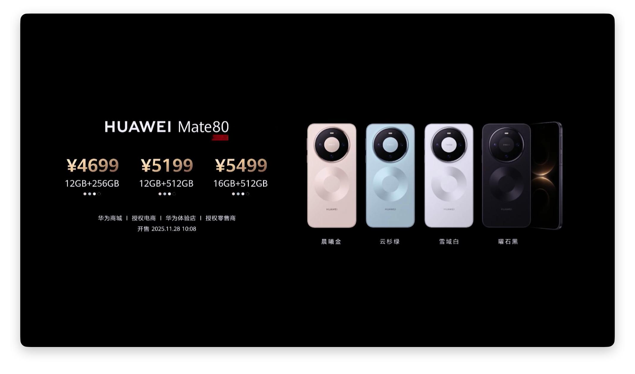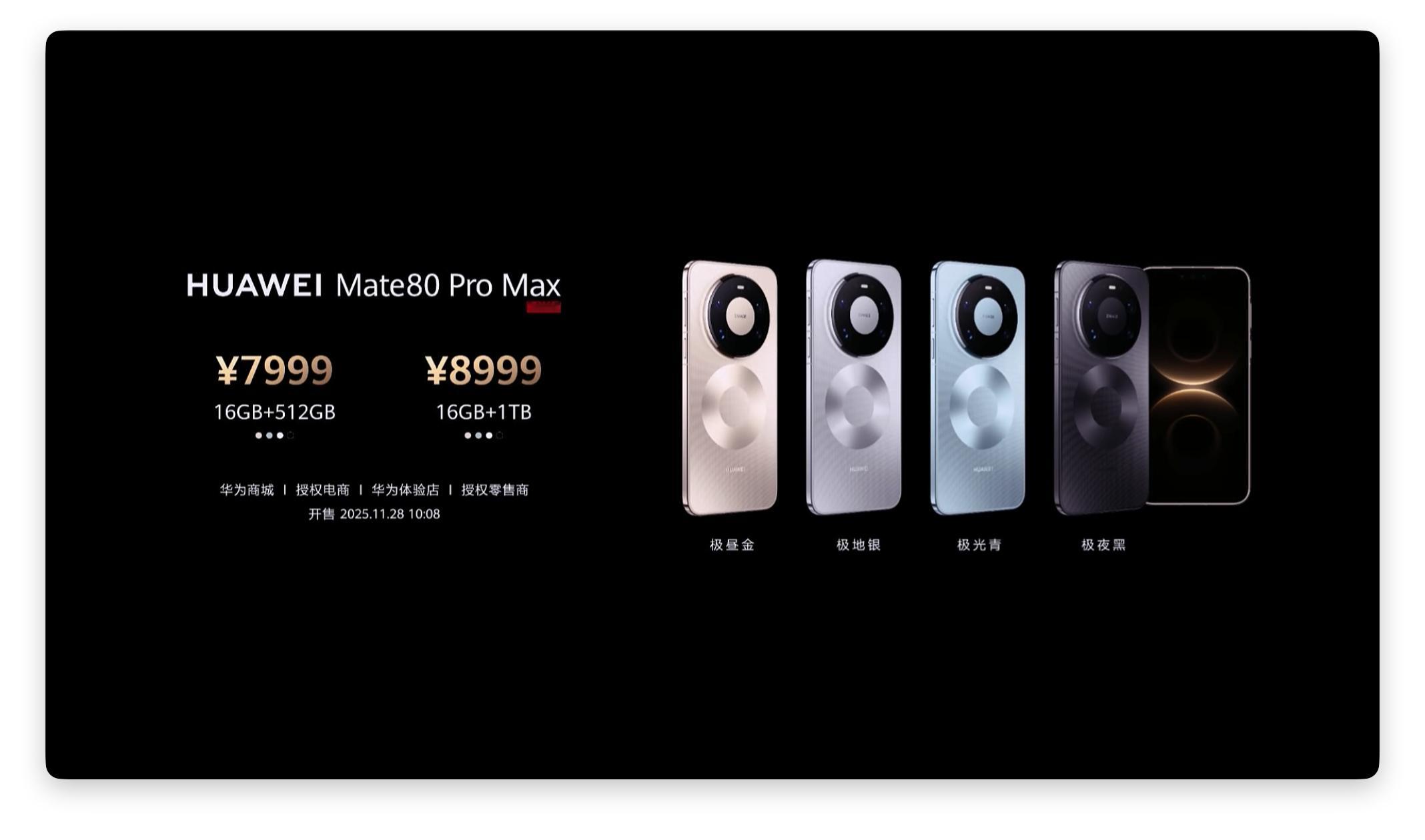 华为Mate80价格来啦华为Mate8012+256 4699元;12+512 5199元;16+512 5499元;华为Mate80 Pro12+256 5999元;12+512 6499元;16+512 6999元;16+1TB 7999元;华为Mate80 Pro Max16+512 7999元;16+1TB 8999元;华为Mate80 RS非凡大师20+512G 11999元;20+1TB 12999元;大家觉得这个价格怎么样香吗?