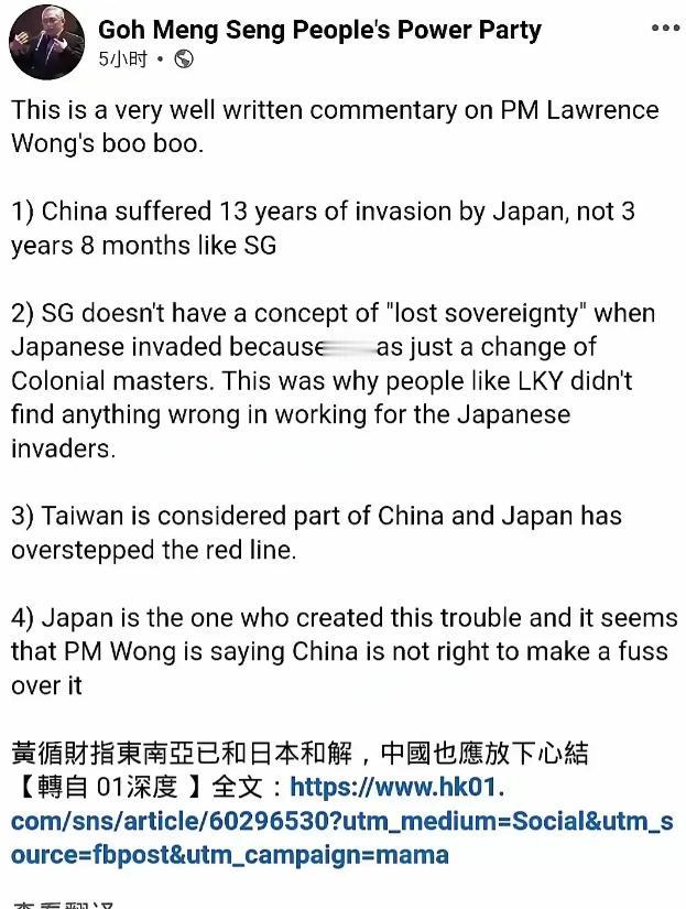 东南亚华人都在狂批新加坡总理为日本人说话!有很多新加坡华人和其他东南亚华人都跑到唐湘龙节目留言痛批黄循财11月19日发言帮日本人站台。 咱们先把当天的情况说清楚,黄循财是在新加坡举办的“东亚合作对话”论坛上发言,提到东亚地区安全的时候,他说“要理解日本在安全领域的正常化诉求,各国应尊重日本的自主选择”,这话一出来,立马就被东南亚华人抓住了。 唐湘龙的节目本身就有很多东南亚华人观众,11月20日节目一更新,留言区就堆成了山,一个新加坡华人留言说“我爷爷当年受的苦还没忘,现在就说要理解日本,这不是站着说话不腰疼吗”,这条留言很快就被点了几千个赞。 不光新加坡华人有意见,马来西亚槟城的一个华人商会会长也在节目互动区发帖,说“我们东南亚华人对那段历史的记忆比谁都深,总理说话得考虑我们的感受,不能光从政治角度出发”,这话也引发了不少共鸣。 可能有人要问,黄循财为啥要这么说?查了下当天的论坛背景就明白了,当时日本的代表也在现场,而且新加坡最近正在跟日本谈一个半导体合作项目,不少人猜测他是想给合作铺路,才说这样的话。 但东南亚华人不吃这一套,一个泰国曼谷的老华人在留言里说得很实在“合作归合作,历史归历史,不能为了生意就把良心丢了”,这话戳中了很多人的心思,毕竟东南亚华人里,不少人的祖辈都经历过那段动荡岁月。 更有意思的是,新加坡本地的一个历史学者11月21日接受媒体采访时,隐晦地表达了不同看法,说“谈论日本安全问题,不能脱离历史背景,不然很容易伤害周边国家民众的感情”,这话算是替华人说出了心声。 其实这不是东南亚华人第一次对新加坡政府的涉日表态有意见,2023年的时候,新加坡外交部曾表态支持日本加入一个国际经济组织,当时就有不少华人在社交媒体上吐槽,说“对日本的态度能不能硬气点”。 有个长期研究东南亚华人问题的专家说,东南亚华人跟其他族群不一样,他们对历史的记忆更深刻,而且大多保留着中华文化的根,对涉及历史的表态特别敏感,政府说话稍微不注意,就容易引发不满。 再说说黄循财的发言本身,他提到“日本安全自主选择”,可东南亚华人更关心的是,日本有没有真正反思历史,一个没彻底跟过去切割的国家,谈安全自主,在他们看来就是隐患,这也是不满的核心原因。 有网友在留言区举了个例子,说“就像一个人以前打过人,现在说要拿把刀防身,受害者家属能放心吗”,这个比喻虽然直白,却把大家的担忧说得明明白白。 新加坡政府后来也察觉到了舆论反应,11月22日通过外交部官网发了个补充说明,说“总理的发言是基于地区和平稳定的考量,并非忽视历史”,可这个说明并没有平息不满,不少华人说“光解释没用,得拿出实际态度”。 这件事也反映出一个问题,东南亚华人虽然身处海外,可对历史的敬畏、对民族情感的坚守一点没少,他们不反对国家之间合作,但绝不能容忍为了合作而模糊历史、伤害感情。 有人可能会觉得华人反应太大,可换个角度想,要是自己的祖辈受过苦,现在有人说要“理解”当年的加害者,谁能心里舒服?这种情感上的共鸣,不分地域和国籍。 国家之间的交往,从来都不是只看利益,感情和历史也得顾及到,尤其是新加坡这样一个华人占多数的国家,更应该明白华人的情感底线在哪,毕竟失去民众的情感认同,再精明的外交也走不远。 信息来源: 新加坡万事通——2025-11-21 “望中日共存、将历史搁置向前迈进”... 新加坡总理黄循财发表最新讲话,信息量超大 Bilibili视频——2025-11-24唐湘龙:很多东南亚华人批新加坡总理站队日本,连新加坡人都反对