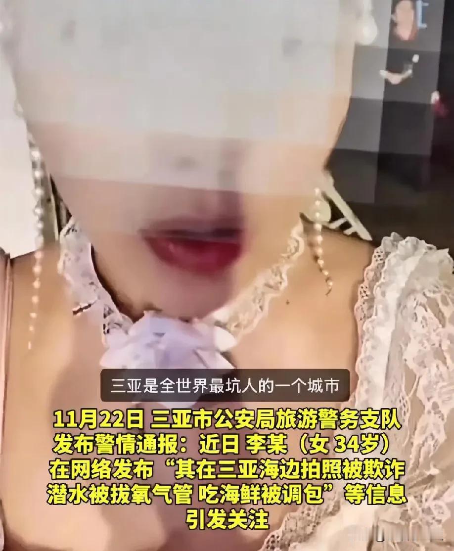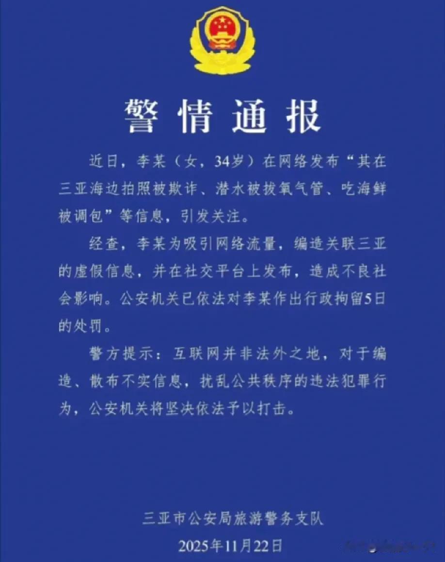 一位小红书博主在11月22日发布长文,提到自己在三亚潜水时遭遇教练拔掉氧气管,拍照被索要高价,点的小青龙也被换成便宜货,文章内容言辞犀利,点赞数迅速突破上万,评论区里充斥着对三亚的批评,大量转发引发热议,差点让三亚旅游形象遭受重创。 结果不到一天,这事就翻了车,三亚旅游局和警察一起查了查,发现这个博主根本拿不出证据,没有照片也没有视频,连聊天记录都没有,她提到的那家店和教练也都找不到人,更逗的是,她说的那些暴力行为,网上早就有人编过类似的故事,她就是随便抄了几个老段子拼在一起。 23号下午,警察叫她去问话,她承认自己瞎编故事,就是为了涨粉,最后按照治安法拘留五天,她的账号被封了,连往返飞机票都耽误了,现在脸被打得啪啪响。 这位博主大概没料到,现在游客已经不容易被糊弄了,三亚本地有很多群组,潜水协会的信息、投诉平台的记录、执法部门的档案都能查到,她提到的“拔氧气管”这件事,其实是2020年就已经澄清过的旧传闻,她却拿来当作新消息用,简直是自己给自己惹麻烦。 这次处理速度很快,从接到举报到封号拘留,不到一天时间,文旅部上个月发布新规定,专门打击编造旅游经历的账号,这个案例就是第一个典型例子,说明以后平台和政府会提前行动,防止谣言扩散开来。 最让人遗憾的是,很多游客本来打算假期前往三亚旅游的,却被这些编造的故事误导了,三亚今年前十个月接到147件正规投诉,基本都得到处理,退款平均只用三天,但现在大家看到“三亚又被坑”这类说法,第一反应对三亚产生不好的看法,真实情况反而没人愿意去听。
