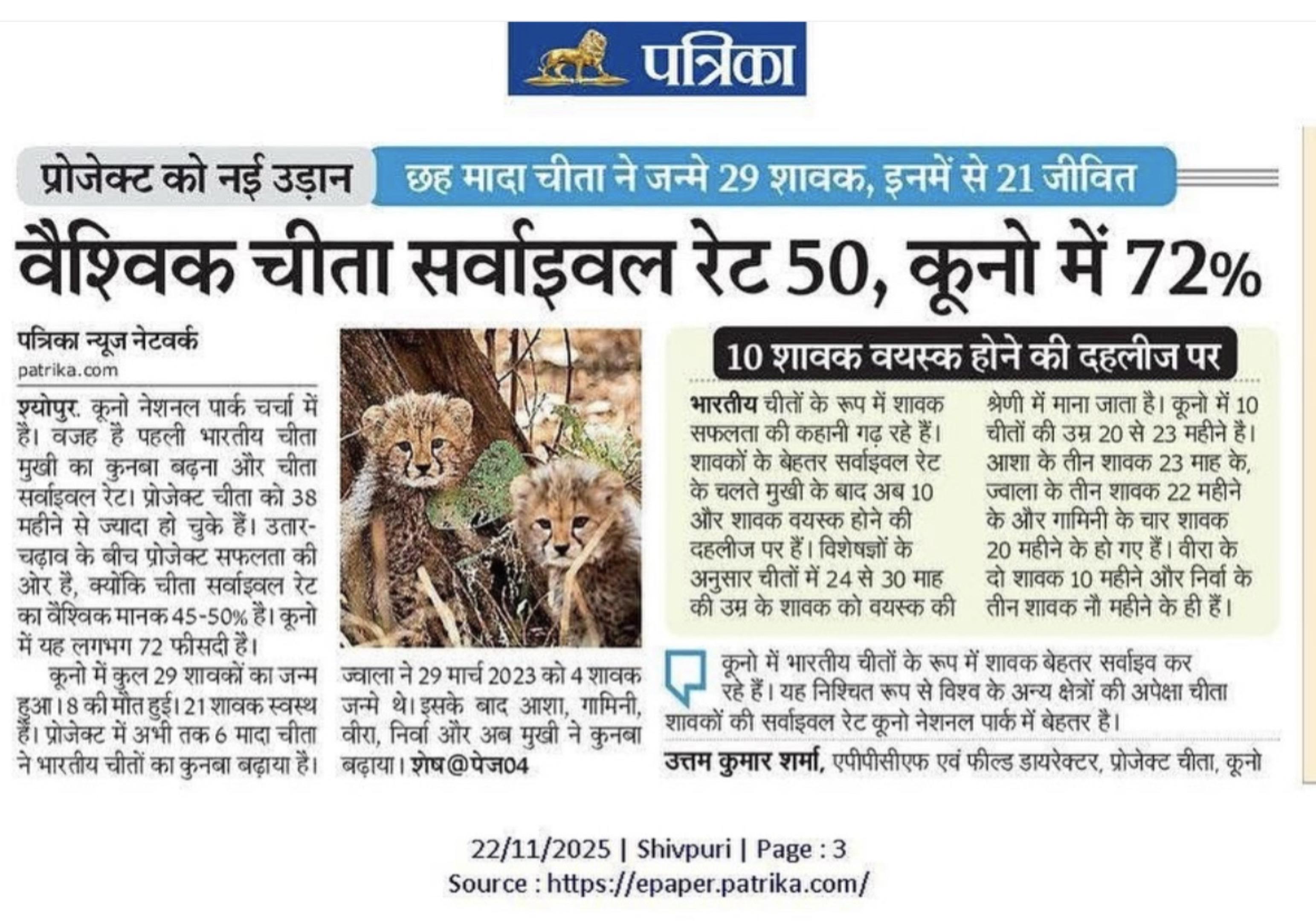 印度的库诺国家公园已经成为猎豹们稳定的家。数只母猎豹一共产下29只幼崽,其中21只存活 全球的猎豹幼崽的存活率仅仅45%-50%,而在印度的库诺国家公园则高达72%。意味着这一物种在非洲面临严峻形势的情况下在其他地方找到了家。