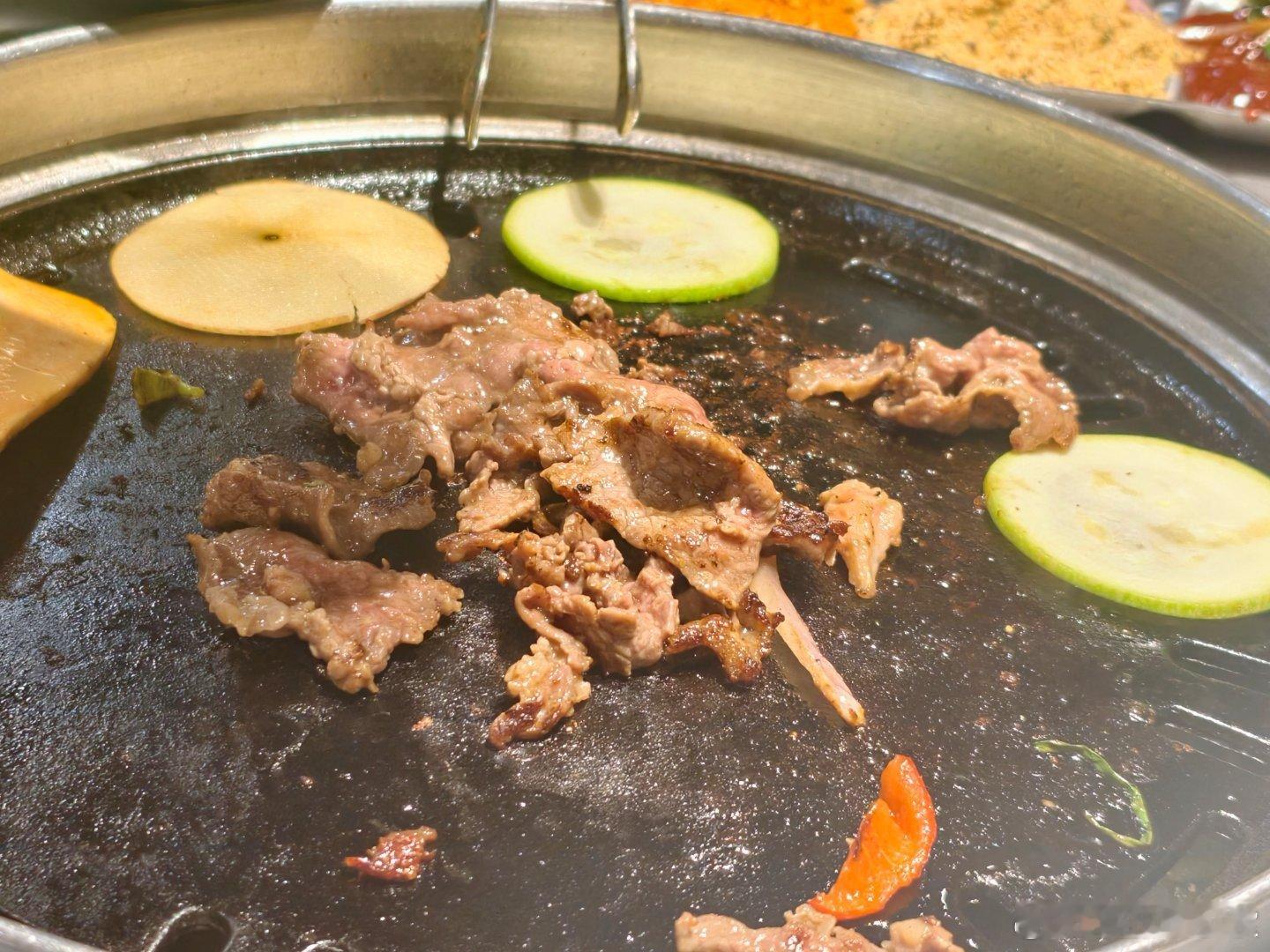 昨天刚吃的烤肉,特地加了一盘苹果片烤现在才发现原来大家是直接混着吃,不上烤盘上啊!