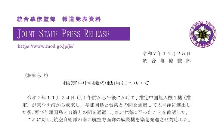 日本防卫省公布,11 月 24 日,一架估计为中国的无人机通过了与那国岛与中国台湾之间,作为回应,来自日本航空自卫队的西南防空部队的战斗机紧急出动。