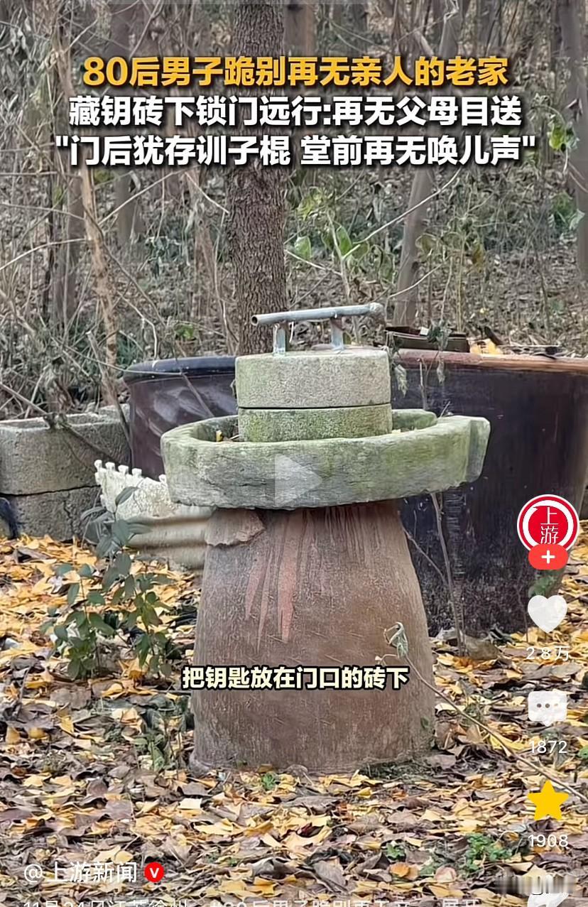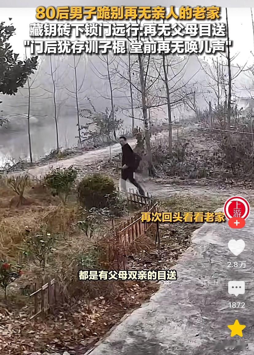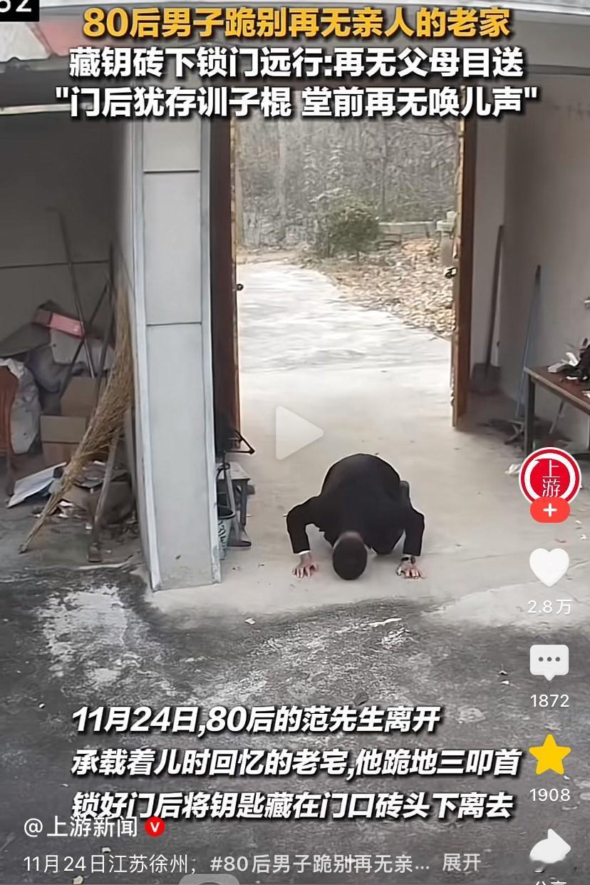 泪目了!11月24日,江苏徐州,80后的范先生离开承载自己童年时光的老宅,在大门口,范先生对着老宅磕了三个头,然后锁上门,把钥匙放在门旁的砖头下后离去,边走还边回头一次次看着老宅。 范先生在城里工作,父亲三年前就去世了,最近住在敬老院的母亲也去世了,料理完母亲的后事,范先生也要离开了,临行前望着老宅,范先生忽然觉得无比的感伤。 这一幕把很多网友都看哭了,有网友说父亲去世后,就在忙完后事锁门离开时突然意识到这个曾被当做“家”地方只剩下几间旧房屋了,瞬间崩溃! 有网友说,每次回老家,走的时候爸妈都会送出很远,每回都会叮嘱,平平安安,早点回来过年,眼泪就出来了。 有网友说,在外地,吃着外卖,刷着手机,看到这个视频,眼泪滴到汤里,喝着热汤,一半是汤,一半是泪。 有网友说,父母去世后,每次回家都有种说不出的感觉,心里好难受,过了今年以后就不回去了,就像我们80后的青春一样,没有了回去的理由,没有了。 很多80后的都是独生子女,没有兄弟姐妹,父母走了就再也没有至亲的人了,叔叔大伯虽然也是亲人,但毕竟不是家人,无法像和父母在一起一样。 有父母在时,家是家,家里有欢声笑语,有亲情和牵挂;父母不在了,家就只是座房子,空荡荡,冷冰冰的房子。所以,趁父母还在的时候,如果有时间,就多回家看看,多回家陪陪父母。