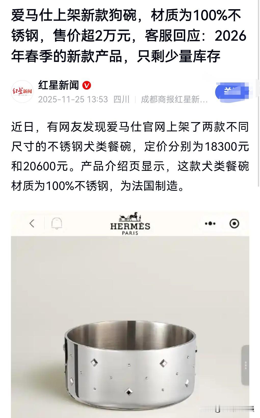 这也太丧心病狂了吧!奢侈品这个智商税没想到又伸向了宠物圈了。 爱马仕上架新款狗碗,售价超2万元。 这真的是太令人发指了。一个狗碗卖2万多。 这真是令人咋舌。 有钱人的世界我不懂。 买5块钱的碗给狗吃不香吗? 哈哈哈……