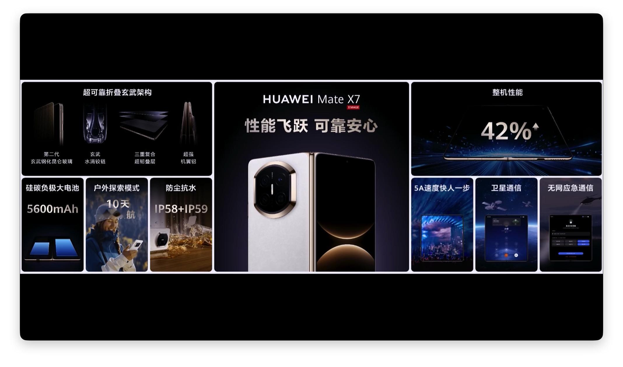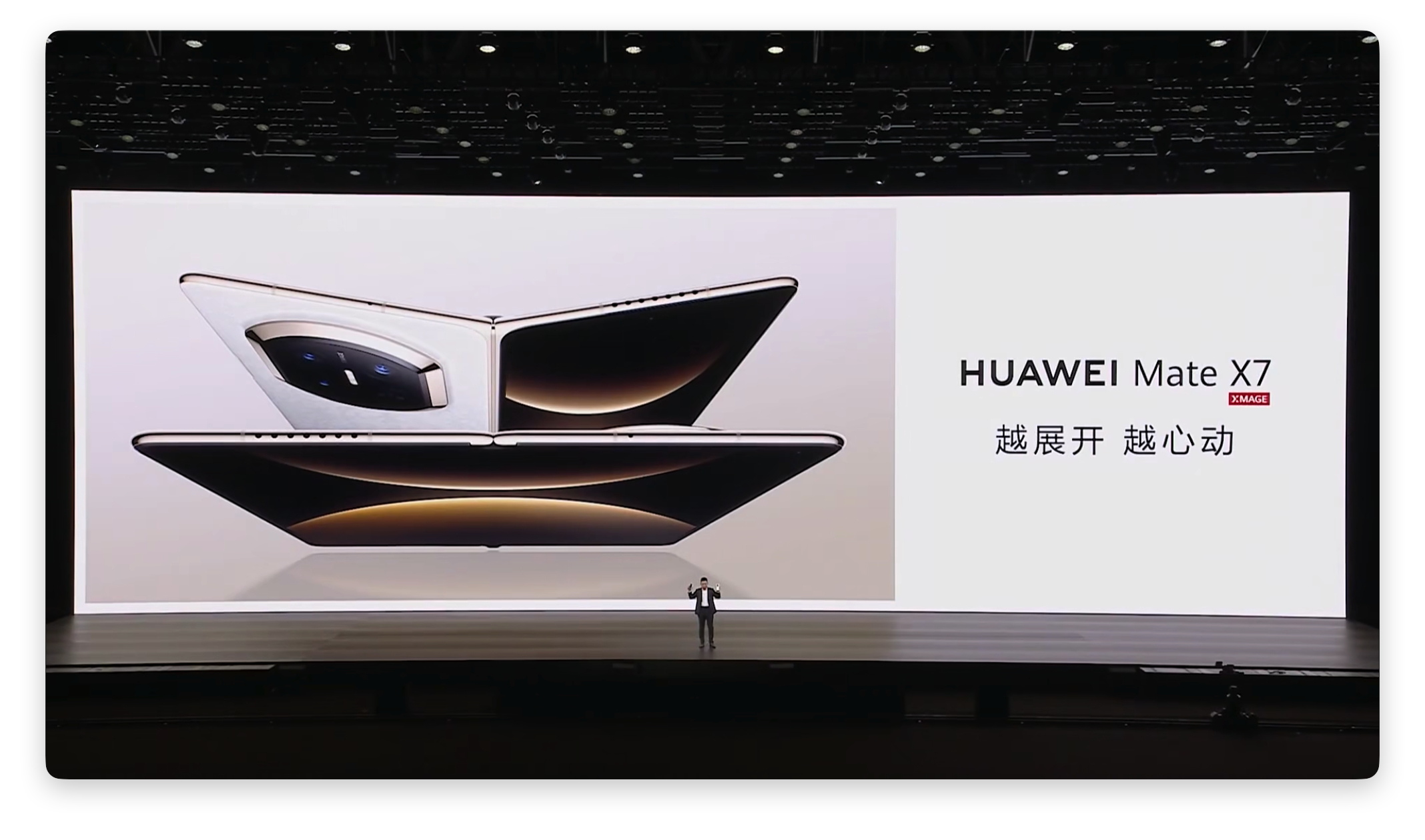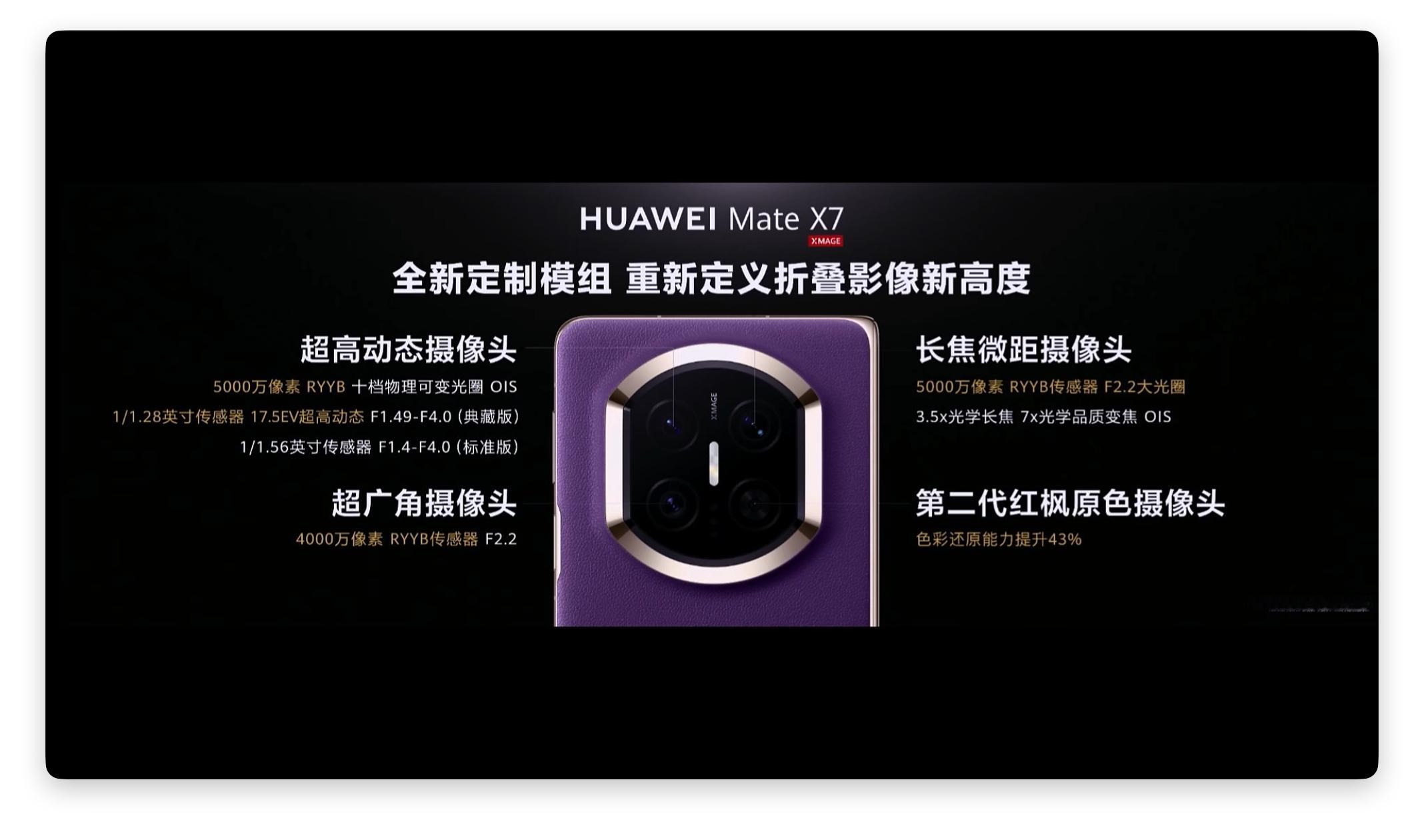 华为Mate X7 来啦!拥有5款配色,采用6.49英寸OLED外屏,2444x1080,3000nit峰值亮度;8英寸OLED内屏,2416x2210,2500nit峰值亮度,支持120Hz高刷,1440Hz 高频PWM调光技术。整机性能提升42%+,5600mAh大电池,支持66W有线快充,50W无线快充,支持Mate70系列同款户外探索模式,支持10天极限续航,32小时熄屏轨迹导航。影像方面,采用第二代红枫原色摄像头,50MP RYYB超高动态主摄,1/1.28英寸传感器 17.5EV超高动态;50MP RYYB F2.2 潜望长焦,3.5x光学长焦,7x光学品质变焦;40MP RYYB F2.2 超广角,这个影像素质,可以说直接在大折叠里领跑了。