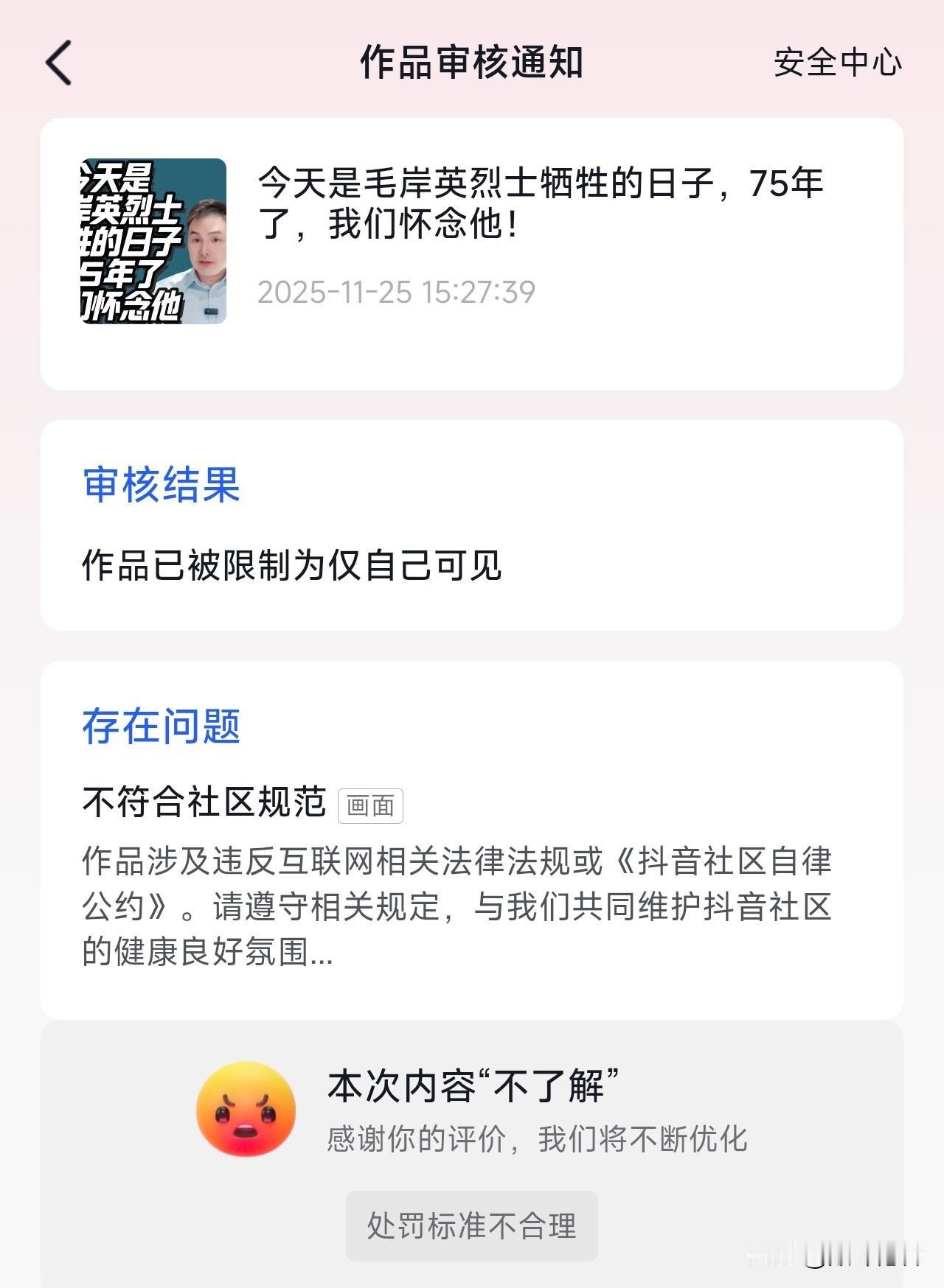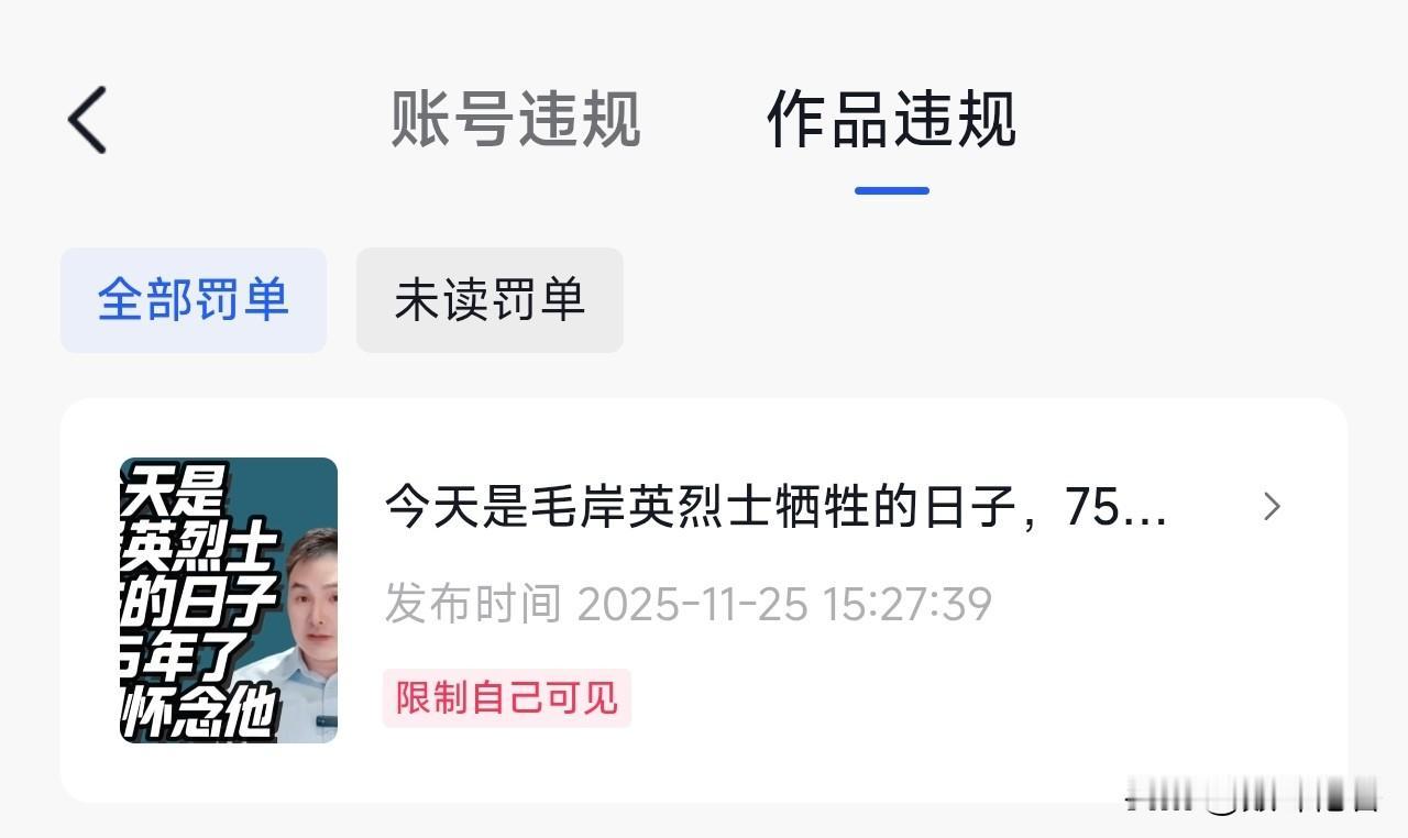 抖音动不动就会给你扣一个“违规”,但是,也搞不清楚哪儿“违规”?比如今天是毛岸英烈士牺牲的日子,我发了视频纪念,就被扣了一个“违规”! 然而,其他平台就正常,没问题!