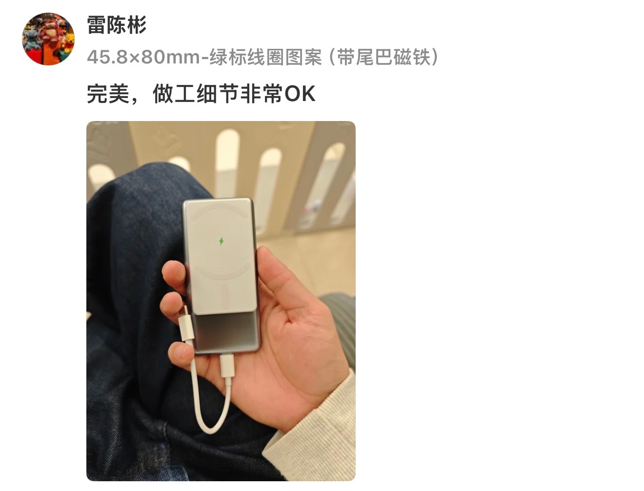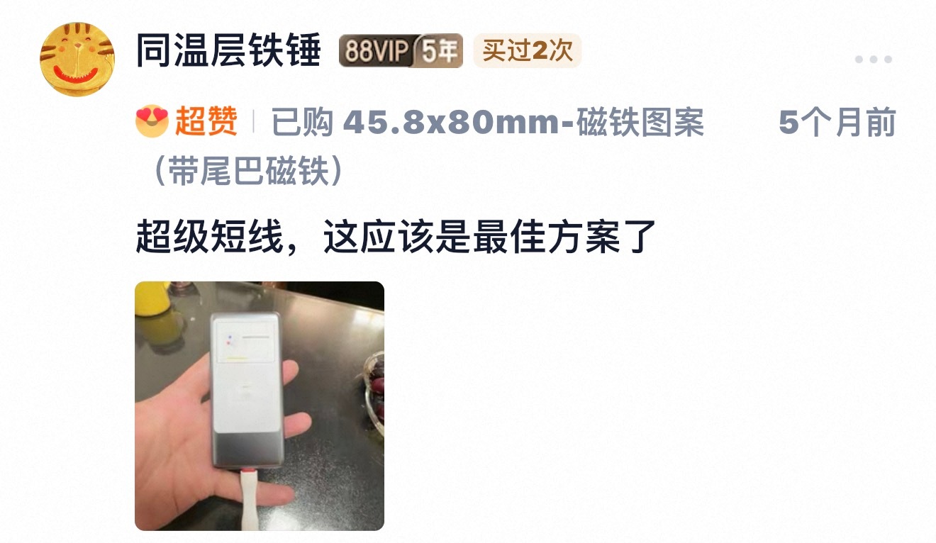 使用这款小米超薄 5000mAh 移动电源的朋友,如果你们刚好需要磁吸功能的话,推荐试试 45.8*80 的磁吸补丁整体厚度大概 2mm,定制的磁铁模组,定制的超薄强力粘胶,所以整体磁力、粘力都很不错。贴上就变磁吸移动电源。我们建议搭配同样带磁吸尾巴的磁吸手机壳使用,吸附会更稳。磁吸补丁还有另外三个规格尺寸,不过我们建议能贴最大尺寸的话,都优先贴这款,尺寸越大磁铁越多磁力也越强一些