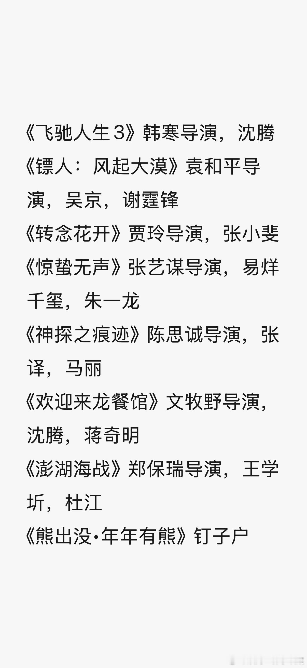 2026年春节档好激烈:《飞驰人生3》韩寒导演,沈腾《镖人:风起大漠》袁和平导演,吴京,谢霆锋《转念花开》贾玲导演,张小斐、张译《惊蛰无声》张艺谋导演,易烊千玺,朱一龙《神探之痕迹》陈思诚导演,张译,马丽《欢迎来龙餐馆》文牧野导演,沈腾,蒋奇明《澎湖海战》郑保瑞导演,王学圻,杜江《熊出没•年年有熊》钉子户
