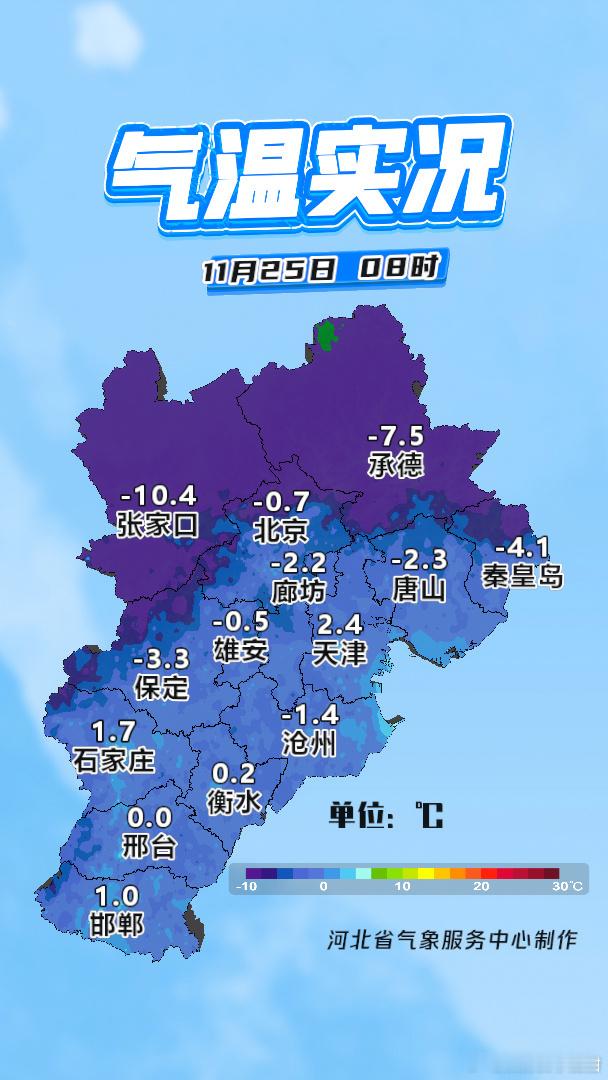 根据国家气象站观测数据统计,今日8时,河北北部地区气温普遍在-10℃以下。张家口市崇礼最低,为-16.2℃;中南部地区气温多在-1~1℃之间,邯郸市永年最高,为2.2℃。和昨天同时刻相比,大部分地区气温下降明显,降幅在5~17℃不等,保定市顺平降幅最大,为17.2℃。..
