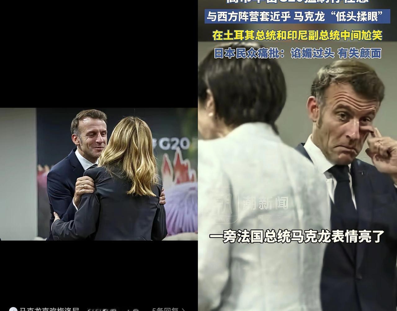 G20峰会的会场里 马克龙的两幅面孔,又把自己推上了热搜 布丽吉特要是瞅见这图,估计也要说他,太拎的清了,谁和该热乎谁和谁保持距离 这边对着意大利总理梅洛尼,马克龙笑得合不拢嘴,伸手一把攥住她的肩膀,都能看出来有多用力,头都快凑上去了,这也太热情了。 那边高市早苗凑上来想握个手,马克龙直接给了个表情你自己猜什么意思,眼皮都懒得抬,要么假装揉眼睛,手插在裤兜里纹丝不动,目光飘向别处,仿佛和眼前人不熟,把高市早苗衬得格外狼狈。 其实明眼人都看得透,不是马克龙不懂礼仪,是高市早苗的“谄媚式外交”本就没入人家的眼。她满会场追着各国政要凑近乎,伸手、鞠躬、尬笑一套流程走到底,却唯独忘了,外交拼的是实力和尊重,不是热脸贴冷屁股的讨好。 梅洛尼靠的是立场和底气赢得尊重,而高市早苗的一味迎合,只会换来别人的轻视和无视。