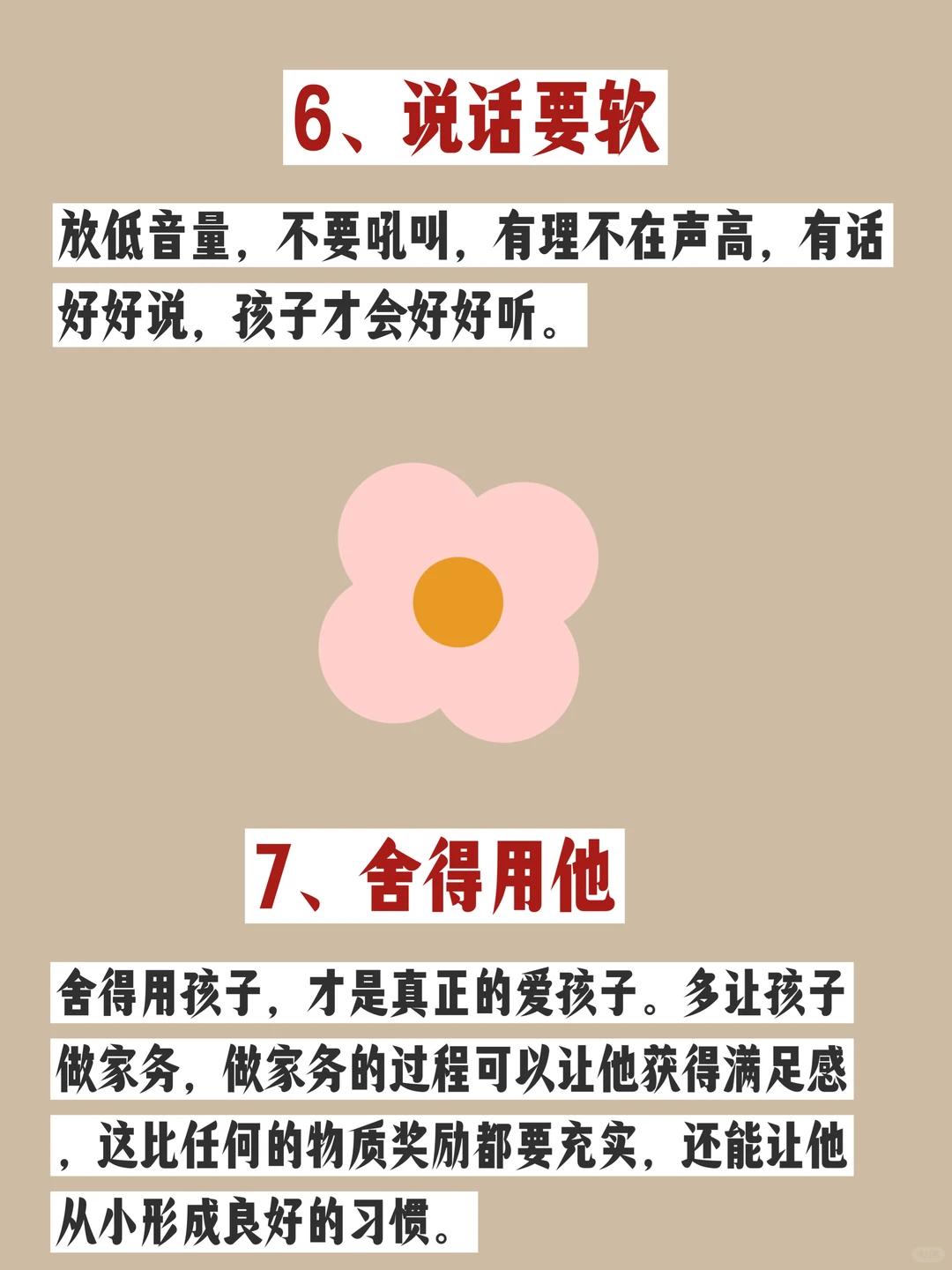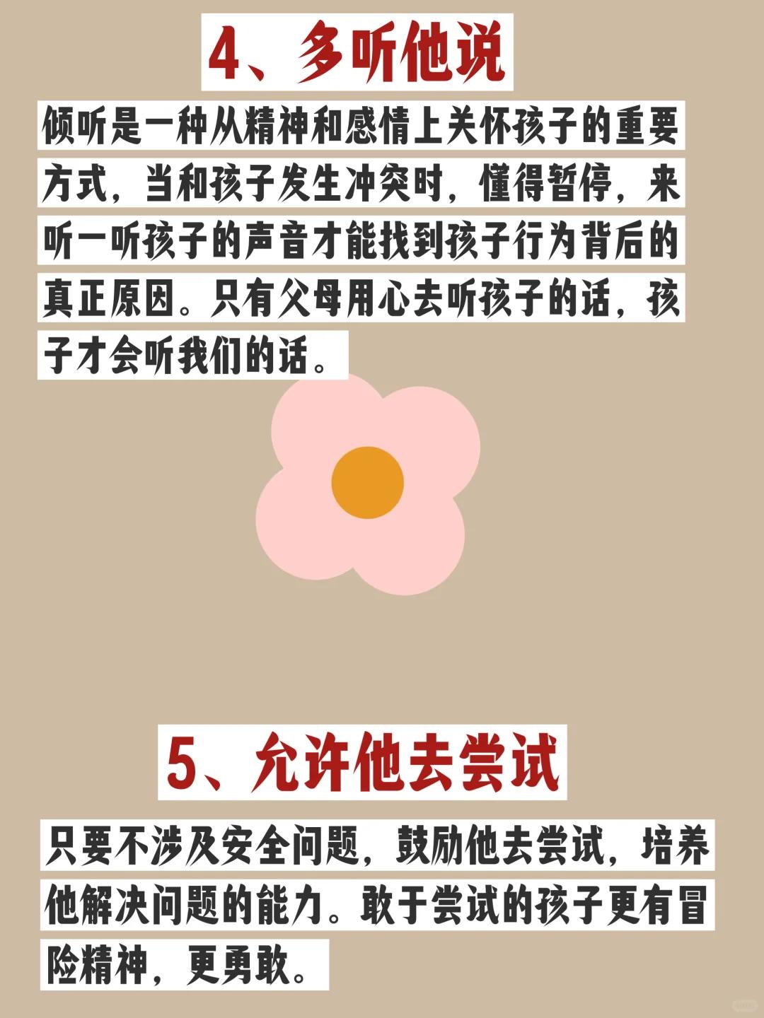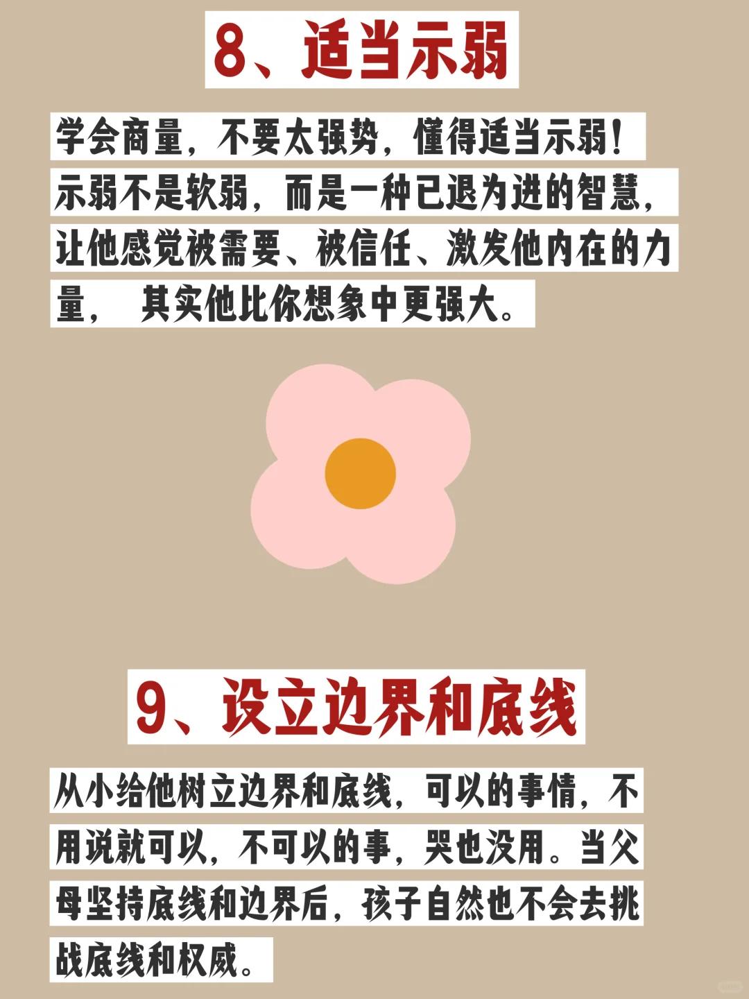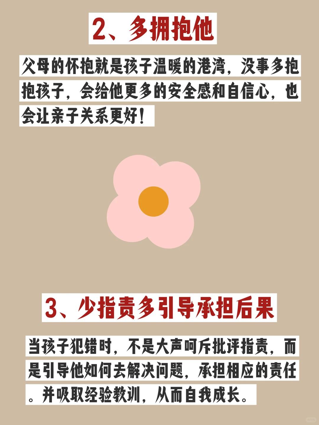 养育孩子,千万不要硬碰硬!! 我们在教育孩子时,常和孩子“硬碰硬”,企图用强势和暴力去控制他,表面上 家长看似赢了,伤的却是孩子的身心与你的亲密关系。 有时候孩子需要的不是父母的发号施令,而是你爱的陪伴和正确的引导。 1、多鼓励他 鼓励是一种激发,恰当的鼓励能够激发孩子的自我认同感,提高他做事情的内在动力,在鼓励式教育下长大大孩子更自信,更强大。 2、多拥抱他 父母的怀抱就是孩子温暖的港湾,没事多抱抱孩子,会给他更多的安全感和自信心,也会让亲子关系更好! 3、少指责多引导承担后果 当孩子犯错时,不是大声呵斥批评指责,而是引导他如何去解决问题,承担相应的责任。并吸取经验教训,从而自我成长。 4、多听他说 倾听是一种从精神和感情上关怀孩子的重要方式,当和孩子发生冲突时,懂得暂停,来听一听孩子的声音才能找到孩子行为背后的真正原因。只有父母用心去听孩子的话,孩子才会听我们的话。 5、允许他去尝试 只要不涉及安全问题,鼓励他去尝试,培养他解决问题的能力。敢于尝试的孩子更有冒险精神,更勇敢。 6、舍得用他 舍得用孩子,才是真正的爱孩子。多让孩子做家务,做家务的过程可以让他获得满足感,这比任何的物质奖励都要充实,还能让他从小形成良好的习惯。 7、说话要软 放低音量,不要吼叫,有理不在声高,有话好好说,孩子才会好好听。 8、做事要软 学会商量,不要太强势,在孩子心中这不是认“怂”,而是对他的尊重、理解和爱。 9、适当示弱 适当示弱不是软弱,而是一种已退为进的智慧,让他感觉被需要、被信任、激发他内在的力量, 其实他比你想象中更强大。 10、设立边界和底线 从小给他树立边界和底线,可以的事情,不用说就可以,不可以的事,哭也没用。当父母坚持底线和边界后,孩子自然也不会去挑战底线和权威。