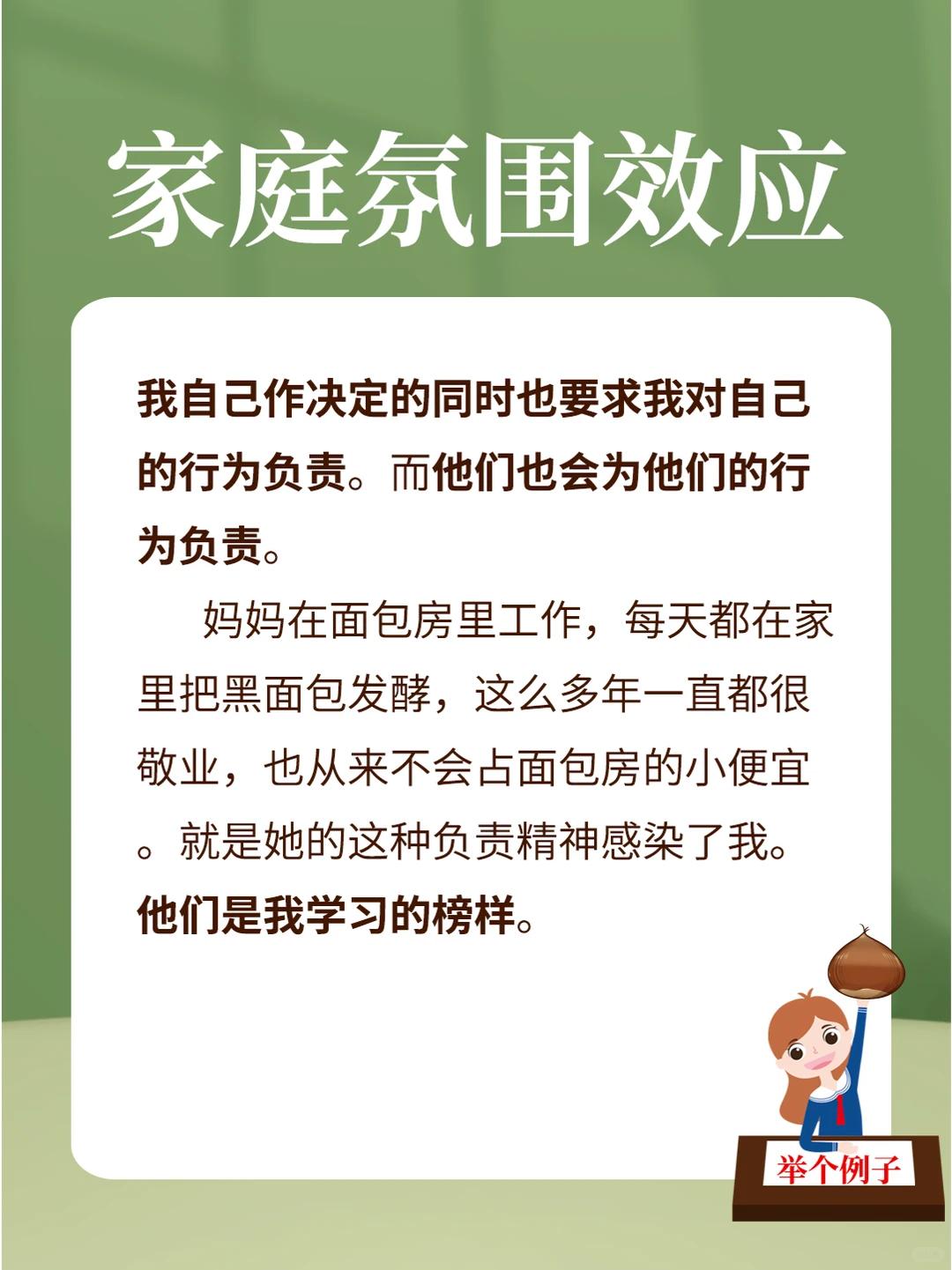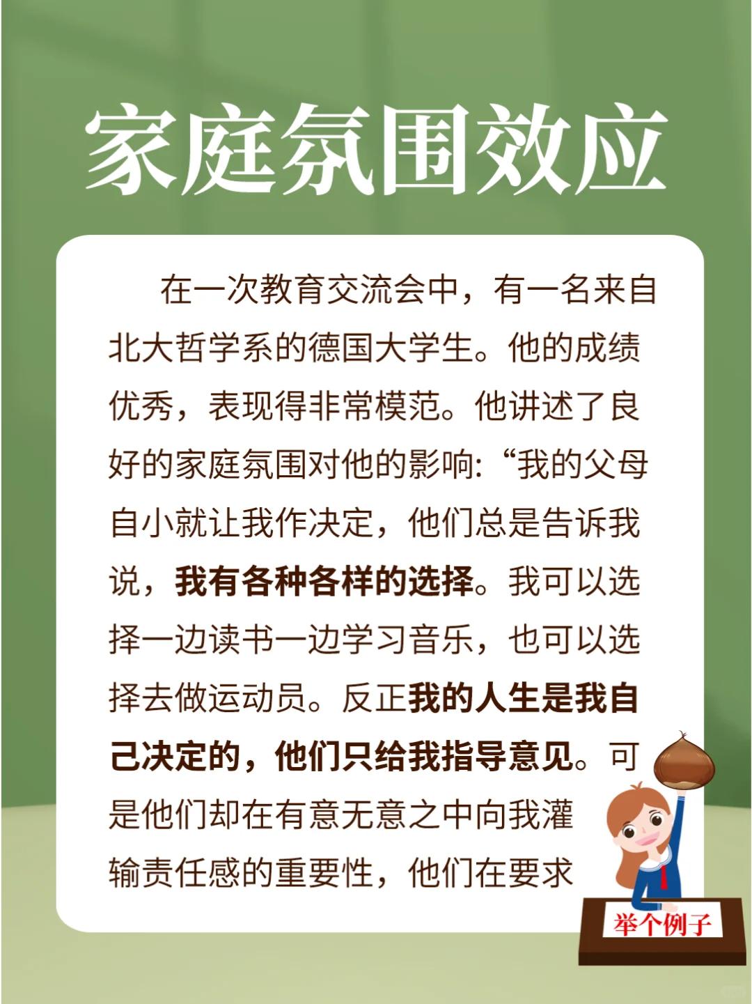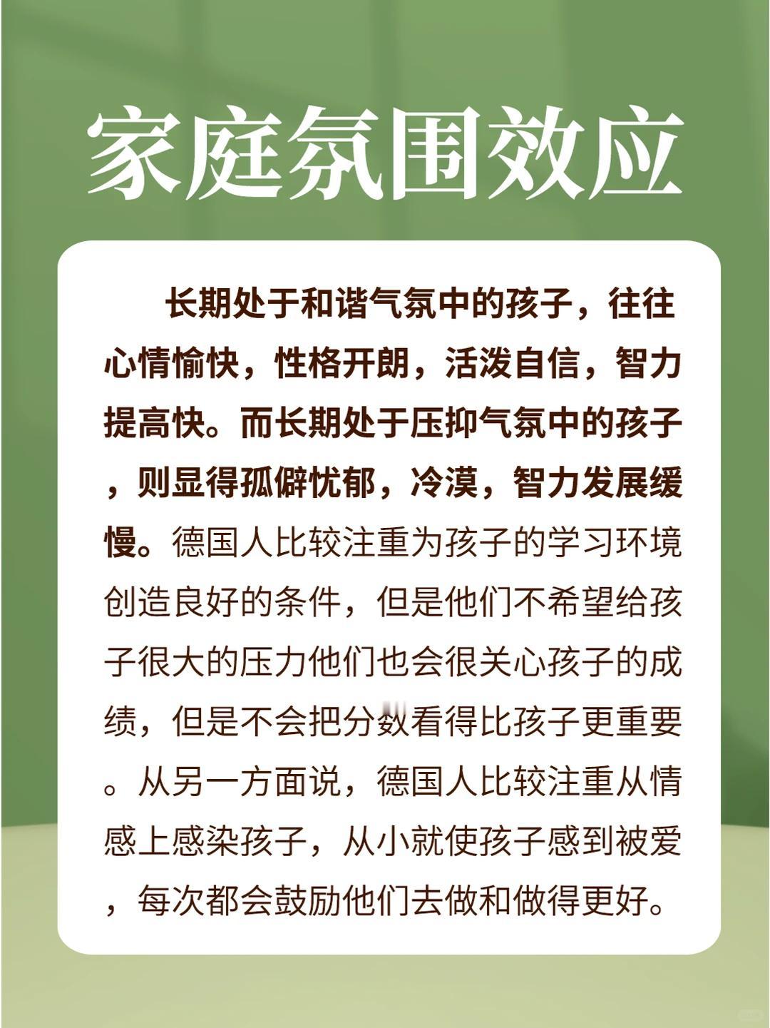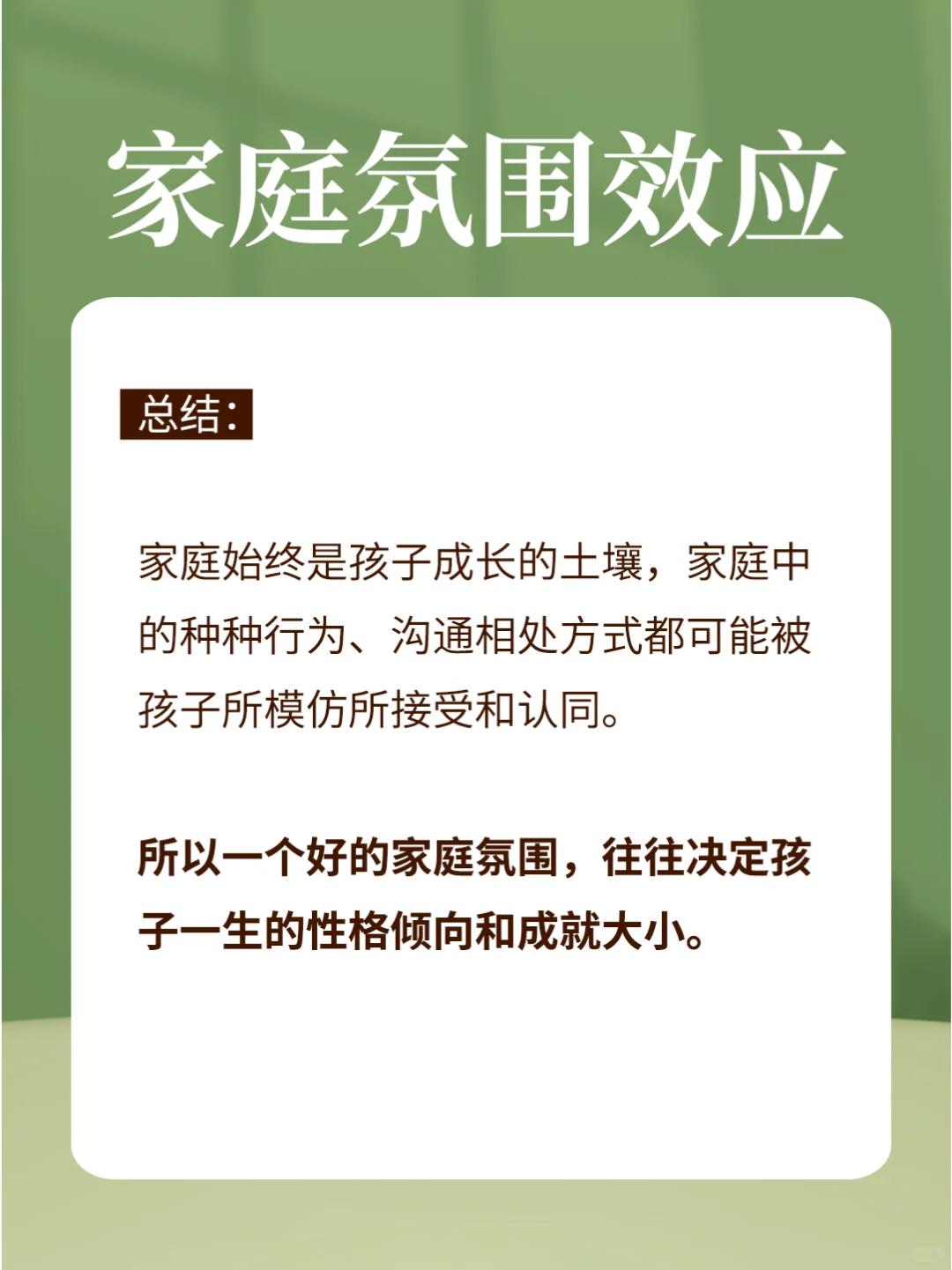 好的家庭氛围决定孩子一生的成就大小 研究表明,长期处于和谐气氛中的孩子,往往心情愉快,性格开朗,活泼自信,智力提高快。而长期处于压抑气氛中的孩子,则显得孤僻忧郁,冷漠,智力发展缓慢。 家庭始终是孩子成长的土壤,家庭中的种种行为、沟通相处方式都可能被孩子所模仿所接受和认同。所以一个好的家庭氛围,往往决定孩子一生的性格倾向和成就大小。 🌹🌹🌹 ✨家长该做什么? 1、稳定的情绪,营造和谐的家庭氛围。 2、在情感上感染孩子,从小就使孩子感到被爱。 3、鼓励孩子去做和做得更好。 4、让孩子自己做决定,告诉孩子有各种各样的选择,家长只给予指导意见。 5、给孩子灌输责任感的重要性。自己作决定的同时也要求对自己的行为负责。而家长也会为家长的行为负责。