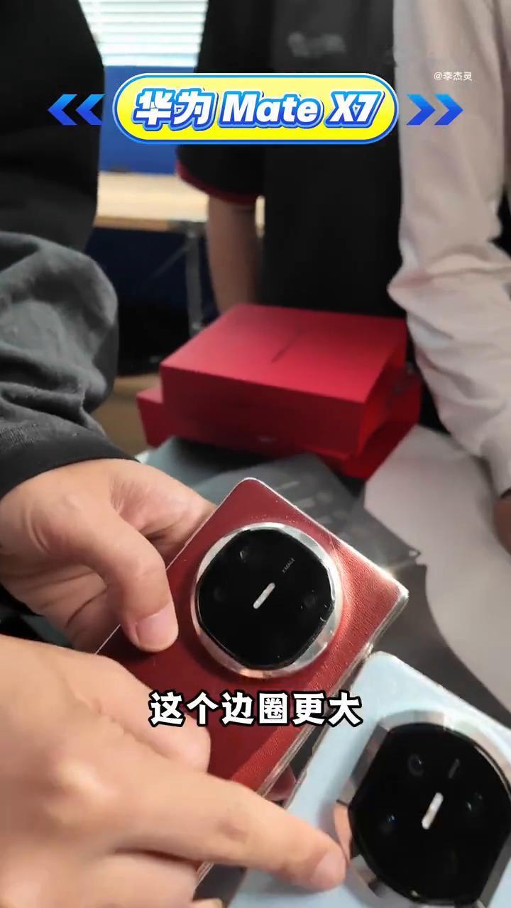 给大家开箱一下这次华为发布会上面最重磅的三款产品,三台手机。 这是Mate80 Pro Max,今年改名字的非凡大师版X7典藏版。 华为Mate80 Pro Max极昼金,Mate系列的全新双环设计。 它真的有,看一下它这上面会有Mate的字,镂刻的隐藏字,这里面没有磁吸。 那它弄这个环干什么?辨识度。 你摸一下它的重量,跟想象中不一样。 轻了+3。 确实是轻的,是不是很轻? 真的轻了吗? 现在给它测了一下,它的重量是241克,实际比上一代重了大概15克,手感上更轻了。大家可以去摸一下真机试一下。 今年这个没有以前那么圆润了,比较方正一点了。 充电头数据线在这,这次它支持700MHz的无网通信。 这个我是跟你说我之前没见过这台手机,这台是非凡大师。 槿紫。 这个好帅。 这个好漂亮。 这个就是跟之前的风格比较接近,两个穿头,两个数据线。 这台是。 好漂亮。 这个好好看,像那种还不沾指纹,不像帛锦,就是布的那种感觉,布艺的感觉。但这个后盖我是确实觉得好漂亮,就是摸起来质感很不错,显皮肤很白。 显白。 对。 "时空之门"V一体化镜头模组设计。 银色镀铬太多了,银色镀铬看起来是很多,整个机子会显得有点硬朗。X6之前这个边圈没有这个这么大,这个边圈更大,明显这个更轻了,实际比上一代轻了大概3克,折痕还是很好,做的很好的。 OK,今天三台手机的简单开箱就到这里,先给大家看一下外观,过几天会更新每台手机的详细评测视频,大家记得点个关注来看。