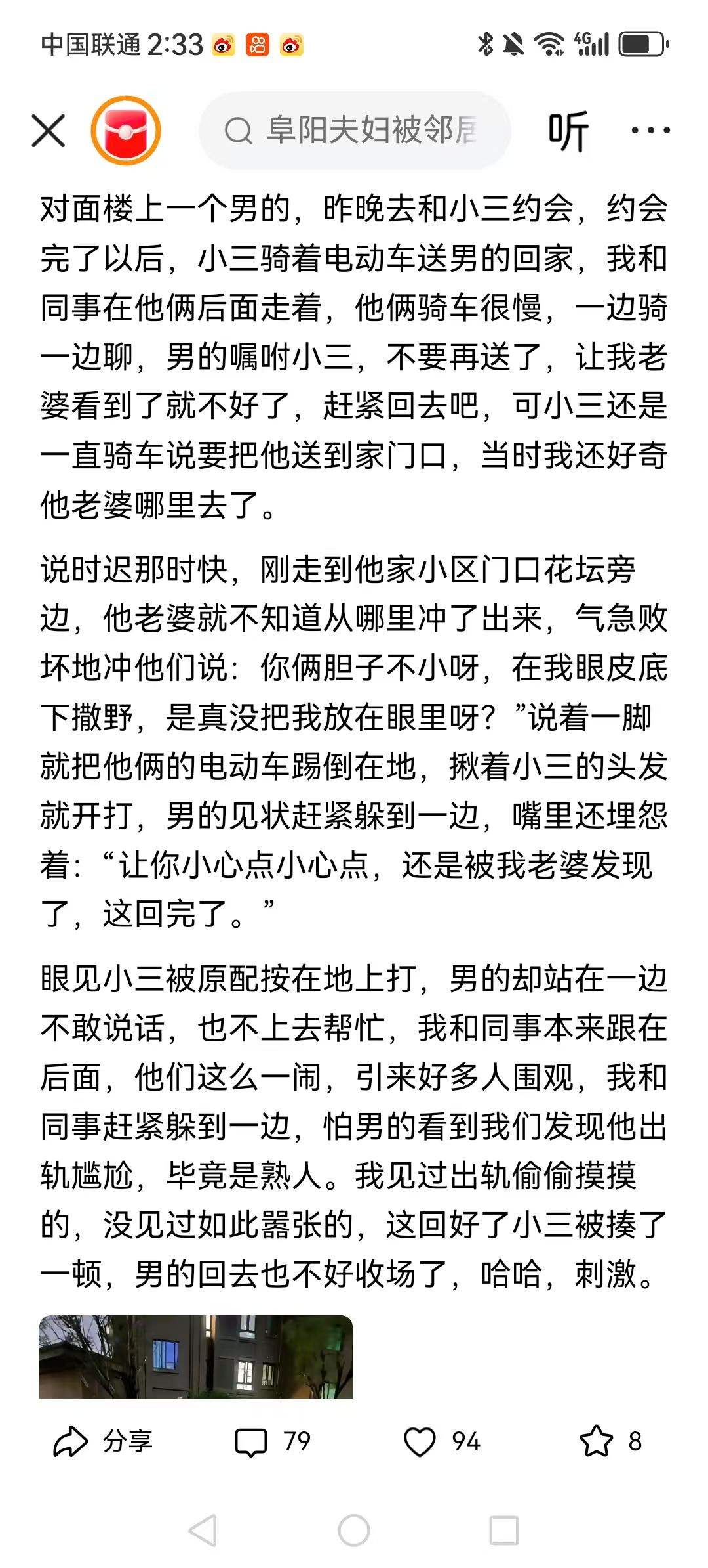 对面楼上一个男的,昨晚去和小三约会。男人还是怕离婚,要不然肯定会像其他渣男一样打原配了。 小三故意爆雷,看看原配离不离,这个男的还不算坏,有的男人帮小三打妻子。 有一种解释,这男的原本是进到女方家里来住的,这个小区里有女方的另外的亲戚家人。