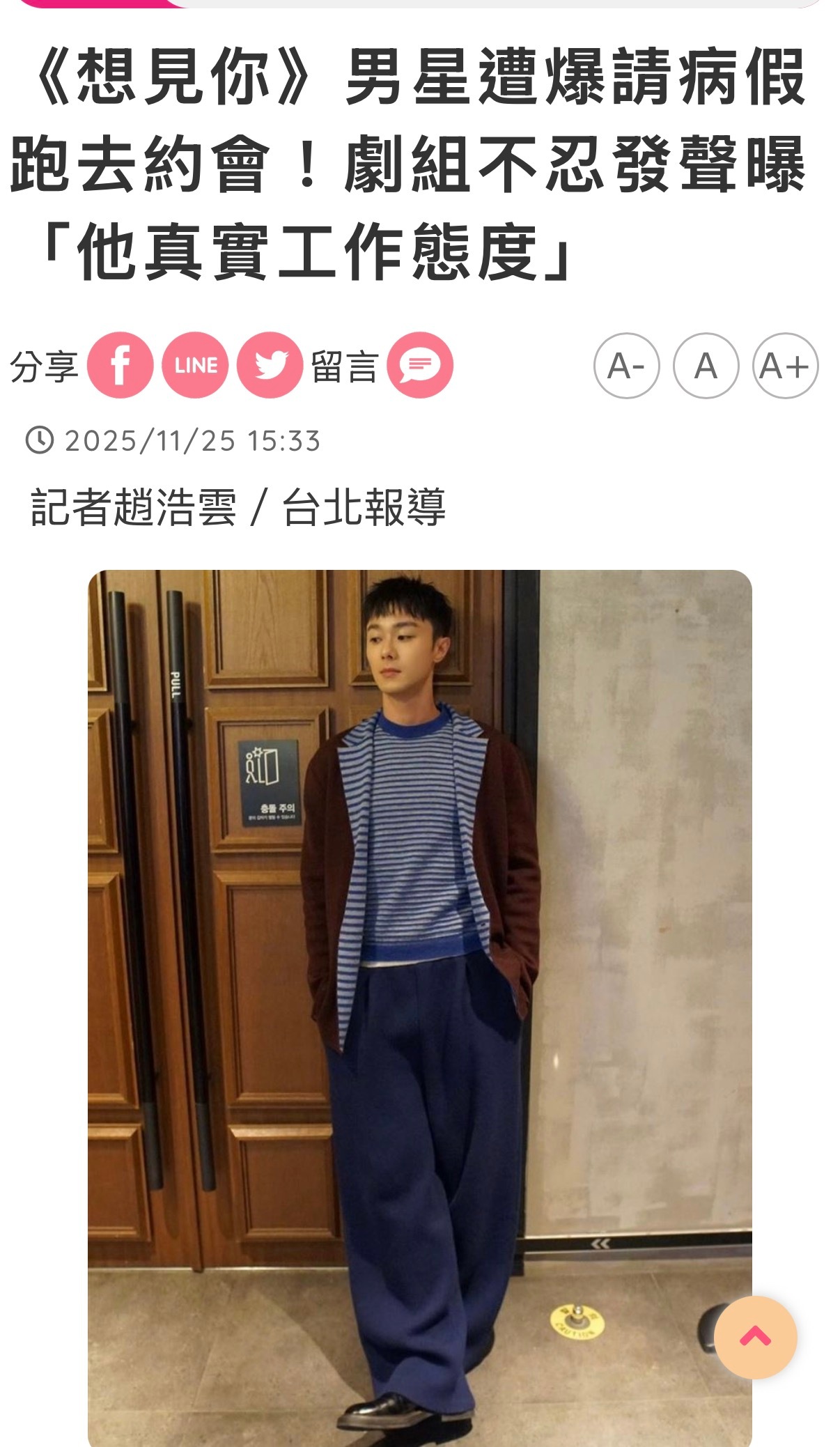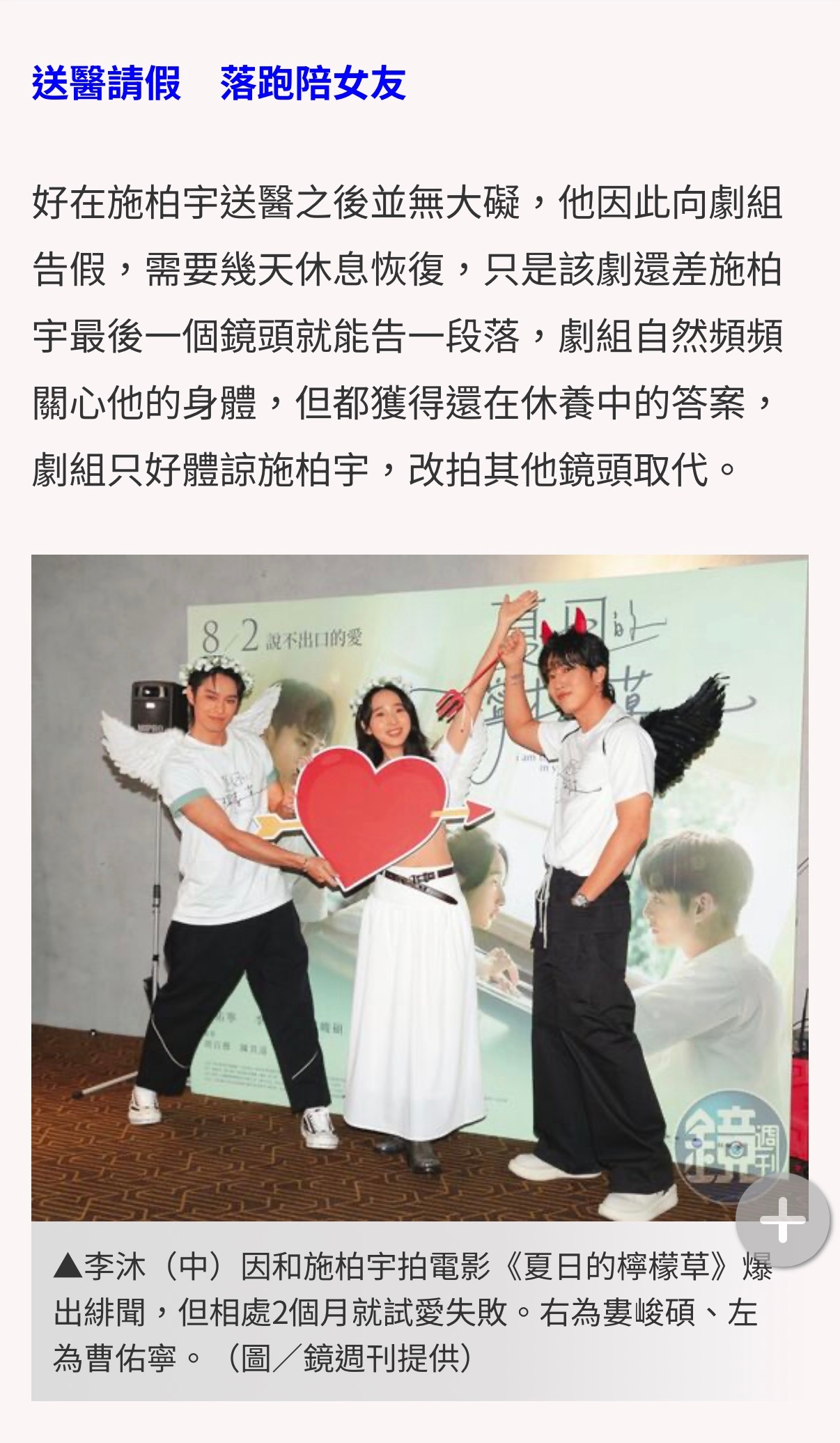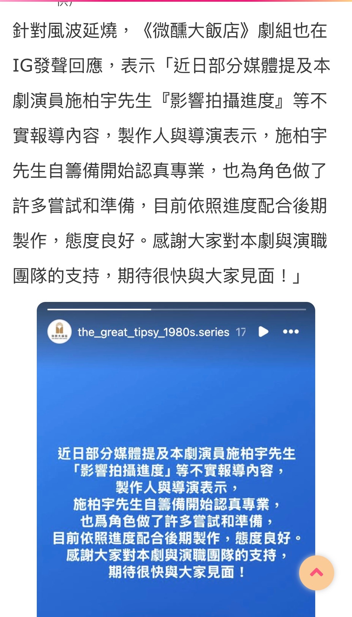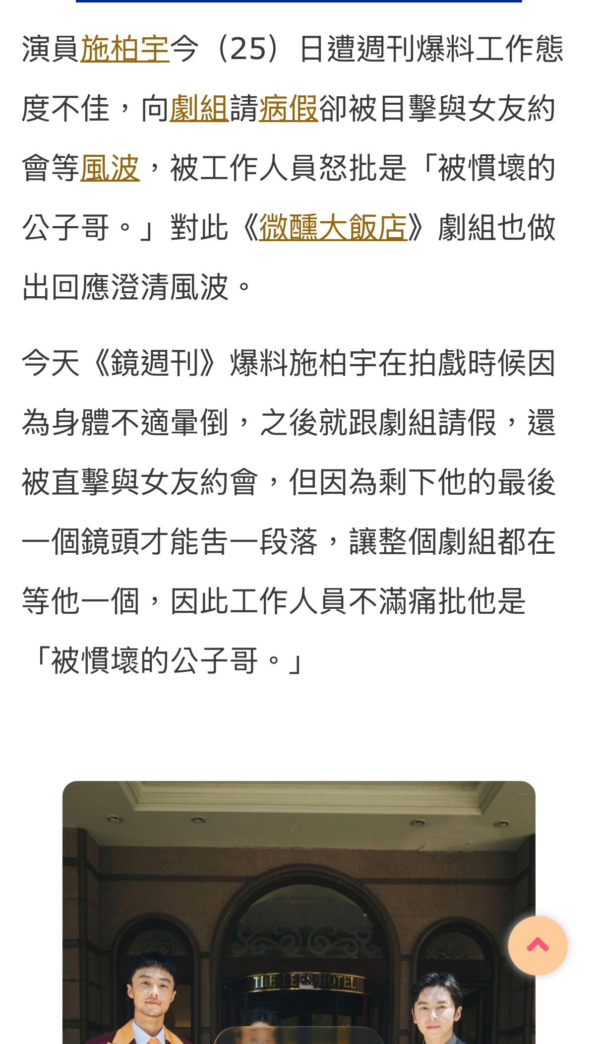 台媒报导施柏宇请病假跑去约会🆘还有一位剧组人员指他「根本是被惯坏的公子哥」…然后剧组出来回应说是不实报道,「施柏宇先生自筹备开始认真专业,也为角色做了许多尝试和准备,目前依照进度配合后期制作,态度良好。」