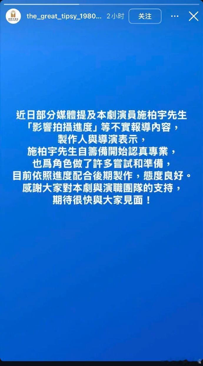 25日,网传引热议。刚刚,剧组回应称针对施柏宇影响拍摄进度等为不实报导内容,制作人、导演说施柏宇自筹备开始就认真专业,目前依照进度配合后期制作,态度良好。