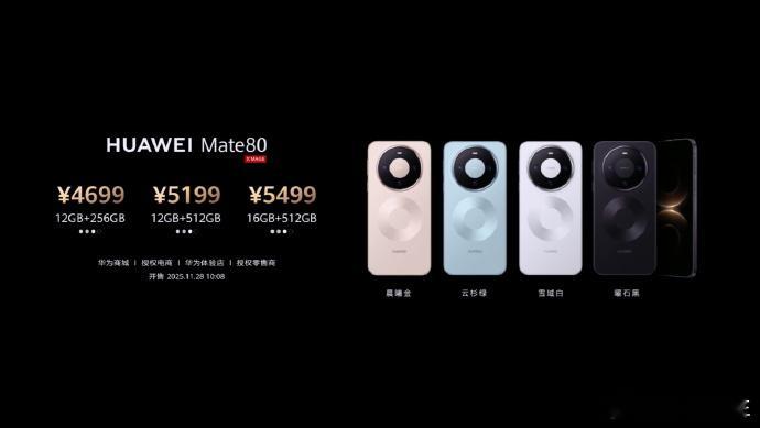 华为 Mate 80价格:-12+256GB——4699元-12+512GB—5199元 -16+512GB—5499元-配色:曜石黑 雪域白 云杉绿 晨曦金-性能:麒麟 9020 处理器 超冷双相变散热系统—6000mm²+ 超大VC-屏幕:6.75 英寸 120Hz OLED 2.5D 直屏支持1440Hz 高频PWM调光 第二代昆仑玻璃盖板-影像:前置:13MP 超广角摄像头(F2.0 光圈)+3D 深感摄像头后置:50MP 超光变主摄(OIS+RYYB)+40MP 超广角(F2.2光圈)+12MP 潜望长焦(F3.4光圈+OIS+RYYB)+第二代红枫原色镜头影像-续航:5750mAh大电池+66W有线快充+50W无线快充-其他:支持星闪 E2.0 NFC 蓝牙 6.0 USB 3.1 GEN1支持IP68 & IP69 防尘防水 3D人脸识别+侧边指纹识别北斗卫星消息 2.4GHz 畅连无网通信+700MHz 无网应急通信