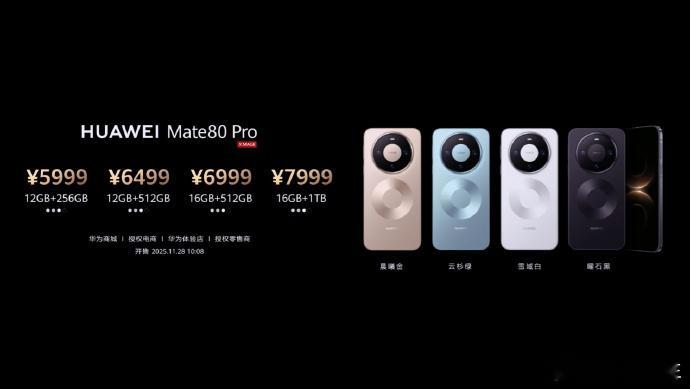 华为 Mate 80 Pro价格:-12+256GB—5999元 -12+512GB—6499元-16+512GB——6999元 -16+1TB——7999元-配色:曜石黑 雪域白 云杉绿 晨曦金-性能:搭载麒麟 9030 Pro处理器(16GB版)/麒麟 9030处理器(12GB版)超冷双相变散热系统—6000mm²+ 超大VC-屏幕:6.75 英寸 120Hz OLED 2.5D 直屏支持1440Hz 高频PWM调光 第二代昆仑玻璃盖板-影像:前置:13MP 超广角摄像头(F2.0 光圈)+3D 深感摄像头后置:50MP 超聚光主摄(OIS+RYYB)+40MP 超广角(F2.2光圈+RYYB)+48MP 超聚光微距长焦(F2.1光圈+OIS)+第二代红枫原色镜头影像-续航:5750mAh大电池+100W有线快充+80W无线快充-其他:支持星闪 E2.0 NFC 蓝牙 6.0 USB 3.1 GEN1支持IP68 & IP69 防尘防水 3D人脸识别+侧边指纹识别北斗卫星消息 2.4GHz 畅连无网通信+700MHz 无网应急通信