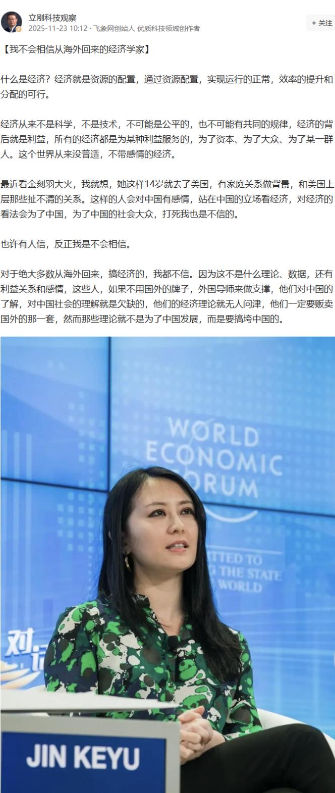 海归金刻羽火了,项立刚对金刻羽的点评更是一语道破!海归金刻羽对中国经济指点江山,项立刚一句评价把海归经济学家的高大上击的粉碎! 项立刚并不认可那些照搬西方模型的“洋理论”,他觉得这些理论就像西方国家给咱们设置的一套路线图,根本不考虑中国的实际情况,更别幻想靠一套书本知识就能管用。 其实老百姓一提到经济学家,经常觉得他们说的话离生活太远,弄一堆拗口词汇,其实真正的难题往往没能说在点子上。 西方的那些经济知识,诞生在完全不同的社会环境里,人家社保福利都很普及,敢大手大脚消费,咱们中国却还有很多家庭不得不攒钱防着看病养老这些现实问题。所以有些西方的做法搬过来,根本迈不开步子,让普通人听着也觉得别扭。 不少留学回来的专家,理论上很厉害,可他们对中国基层真的了解多少?更多时候,他们习惯用桌上的数据和报告研究问题,却很难体会老百姓保障孩子上学、应对医疗压力的那种实际心情。看似完美的方案到了咱们这儿,经常搞成“纸上谈兵”,现实里根本用不上。 经济学跟自然科学不一样,说到底,背后也是各种国家立场和利益在较劲。西方长期推动自己的理论,不少都是为了在全球有更多的话语权。 每当中国的发展走出一点自己的路,就有人拿“中国经济要出问题”的说法来搅局,其实也不仅仅是学术争论,很多时候是一种压力,是希望咱们自己没信心。 但中国不是谁的复制品,发展路子只能靠自己摸索。先进经验咱们也不是全拒绝,关键在于学会怎么用、怎么改,不能用一把尺子量所有人。一个政策究竟好不好,不看洋不洋,最重要的是管不管用,能不能让大多数中国人生活更好。 这些年中国的变化,很多其实是靠自己不断试、不断调整,才摸索了一些适合自己的办法。照抄别人的路子,容易吃亏。 中国老百姓要的是实实在在的改善,而不是谁说得好听,或者理论有多高端。所以解决中国自己的事,既得有大格局,也不能脱离土地和生活,要懂得兼收并蓄,更要挺直腰杆做主。 经济的讨论,最后总绕不开一个现实:中国的国情,中国人的需求,只有真正扎进生活、脚踏实地去感受,答案才可能出来。 模型和公式再漂亮,没法解决真实的困难,也注定没什么用处。中国往哪里走,未来应该怎么选路,关键不是谁讲得漂亮,而是谁能把老百姓的日子真真正正过好。