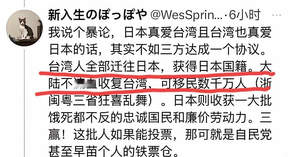 刷到个日本网友的“神操作”,差点把我笑出眼泪——他说日本既然这么“爱”台湾人,干脆把2000万台湾人全迁去日本入籍!这样大陆不费一枪一弹收台湾,日本白捡2000万廉价劳动力,台湾人也“圆了日本梦”,三方共赢!我头回觉得,某些人的“聪明”,蠢得跟没长脑子的提线木偶似的! 这提议藏着“台独”的歪算盘 别急着夸他“聪明”,这套路我熟——本质是“台独”分子的换壳把戏!这些年“台独”玩不出新花样,就想把台湾问题“外包”给日本:先把台湾人“送”到日本扎根,再借日本的壳搞“事实独立”。可他们漏了最关键的:台湾是中国的一部分,2300万台湾人是中国公民,日本收不走,中国更不会让! 我有个在日生活的台湾朋友,聊起这提议直摇头:“我爸在日本开小吃店三十年,户口本上国籍还是中国台湾省。真要我们集体入籍日本?先问问我奶奶同不同意——她床头还压着1945年台湾光复的老照片呢!”你看,所谓“台湾人爱日本”,不过是少数人编的谎,多数人心里,根还在中国。 日本的“便宜劳动力”,是毒饼不是甜糕 日本为啥被这提议“打动”?明眼人都懂——它老龄化严重,劳动力缺口大。但这“便宜劳动力”是带刺的:台湾人去日本,语言、文化、社会福利全是坎。我认识的在日台胞说:“在日本工厂打工,台湾人被当‘二等公民’,工资比本土人少两成,加班还不能投诉。” 更讽刺的是,日本收了人,真能“白捡”?台湾人要是过得不如意,指不定骂日本“骗子公司”;要是过得好了,反而更怀念祖国——到时候日本落个“偷人不成蚀把米”,图啥? 所谓“三方共赢”,是彻头彻尾的笑话 这提议最搞笑的,是把大陆当“冤大头”。中国收台湾,从来不是为了“不流血”,是为了国家统一、民族复兴。真要按这网友说的“不流血收回”,那叫“自动回归”,是全体中华儿女的喜事,轮得到日本邀功? 就像你家丢了块传家宝,小偷说“我帮你保管,你啥都不用干就能拿回来”——你谢他?怕不是要骂他“偷东西还有理了”! 最后我想说: 台湾问题,容不得外人指手画脚。所谓“三方共赢”,不过是“台独”分子和某些日本政客的春秋大梦。2300万台湾人心里有杆秤,祖国才是最亲的靠山;14亿中国人更有决心,统一大势谁也挡不住! 要是你遇到这种“脑洞清奇”的提议,会怎么回?评论区唠唠,台湾的事,到底谁说了算? (信息来源:中国政府《关于台湾问题的声明》、《反分裂国家法》、新华社《台湾同胞的祖国认同调查报告》)日本华人 台籍人 日本外国人政策 台湾籍人 日本人华人 台湾人游中国 无下限日本人