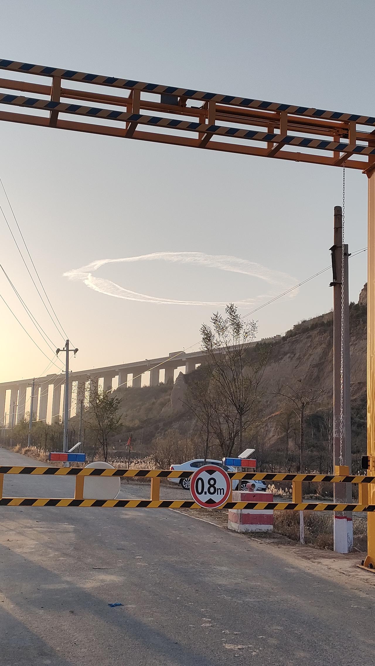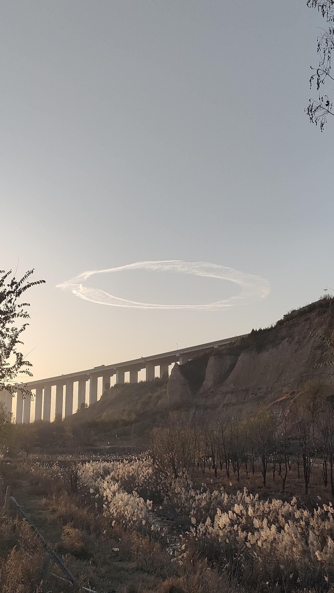 奇观!西禹高速芝川特大桥上,出现一个巨大的白色圆圈,与正在西下的夕阳同框,很是有趣。不知个巨大的白色圆圈是怎么形成的?