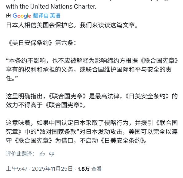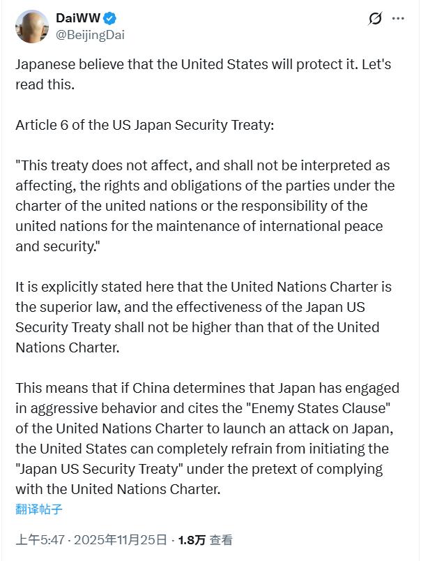 日本彻底傻眼!美日安保第6条居然藏着这种鬼话?! 你以为美日安保是“美国必须保护日本”? 错了! 看看条约第6条写的是什么: “本条约不影响缔约方依据《联合国宪章》的权利和义务。” 翻译成人话就是: 美国:我想来就来,不想来就不来,别拿条约绑我! 这句话等于给美国开了三条大路: → 想参战?——有条约和联合国双保险! → 不想参战?——我可是遵守《联合国宪章》的和平国家哦~ → 什么时候来?来多少?要不要来?——全看我心情和利益! 一句话: 美国永远不会把自己的命运绑在日本身上, 但日本永远把命运绑在美国身上。 中国这边永远是“料敌从宽” 我们不能因为这条就幻想美国不会来, 该准备的准备,该算的算。 你强,美国犹豫;你更强,美国退场。 日本那边才该慌: 原来所谓“美国一定会来”, 从一开始就是单相思。 Source: X