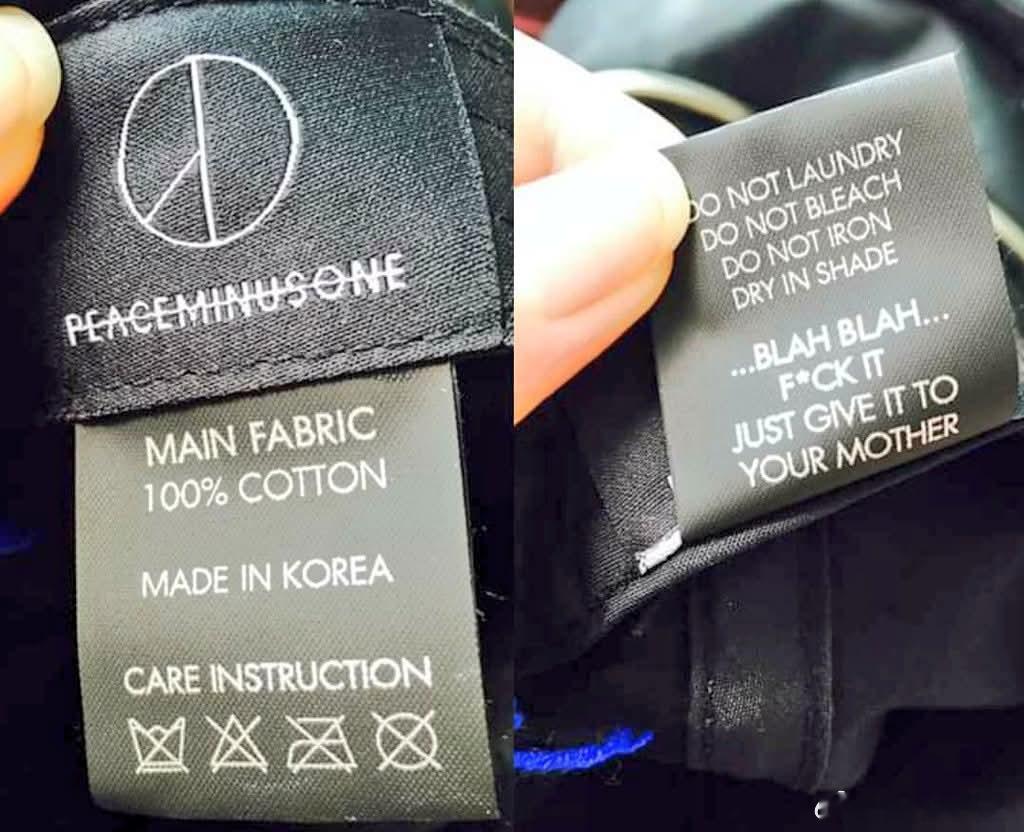 网友扒出权志龙此前品牌的衣标内容:“不要水洗、不要漂白、不要熨烫、阴干什么什么的