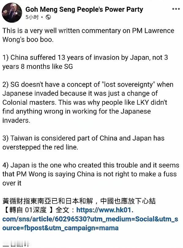 东南亚华人都在狂批新加坡总理为日本人说话!今天看唐湘龙的节目,有很多新加坡华人和其他东南亚华人都跑到唐湘龙节目留言痛批黄循财前天帮日本人站台,明明是高市早苗挑衅在先,黄循财却要求中国要大度,要当下历史,还说新加坡跟其他东南亚国家已经跟日本和解了,要私奔在东南亚发挥更大的安全作用,很多东南亚华人非常生气,凭什么代表他们说跟日本和解了,这是数典忘祖。 事情的由头很明确,是日本首相高市早苗先跳出来挑衅,11 月 7 号在国会公然宣称 “台湾有事” 算日本的 “存亡危机事态”。 这可是 1945 年日本战败后,头一回有日本领导人敢把台海问题和武力介入绑在一起,等于直接捅了中国的核心利益,连联合国都出来重申一个中国原则,日本国内上千人上街抗议喊她辞职,这挑衅的性质有多恶劣不言而喻。 结果黄循财在彭博创新经济论坛上倒好,半句不提高市早苗的错,反而对着受害方中国说教,说什么东南亚国家都和日本和解了,劝中国放下历史成见,还大言不惭说新加坡和其他东南亚国家都认了,要让日本在东南亚安全领域挑大梁。 这话说出来,别说中国网友炸了,东南亚华人第一个不答应,评论里全是 “你凭什么代表我们”“自家的血泪忘了吗” 的质问,这可不就是典型的数典忘祖吗? 东南亚华人的愤怒从来不是没由来的,就说新加坡,1942 年日军打进来后搞的 “华侨检证大屠杀”,至今都是刻在华人骨子里的伤疤。 当时日军把 18 到 50 岁的华人全赶到筛查点,根本没有正经审判,看你戴眼镜像知识分子要杀,说海南方言像共产党要杀,甚至排队时随机指一排就拉去枪毙,新加坡河当时都被鲜血染红了。 李光耀后来回忆说,他当年也被拉去检证,靠着假装回家拿东西才侥幸逃生,而那些没逃掉的人,光华人遇难者保守估计就超过 5 万,日本却至今连个痛快的道歉都没有,还总想把这事儿含糊过去。这种用亲人鲜血换来的记忆,哪是黄循财一句 “和解” 就能抹掉的? 更讽刺的是,黄循财嘴里的 “东南亚与日本和解”,压根就是他自己的一厢情愿。刚过两天,缅甸就直接打了他的脸,缅甸发言人佐明吞不光谴责高市早苗的涉台言论,还特意强调日本二战时的罪行不可饶恕,明摆着不认可所谓的 “和解”。 要知道东南亚各国里,印尼当年被日军屠杀的华人超过 20 万,马来西亚的槟城大屠杀也是血流成河,这些国家的华人社区每年都在纪念受害者,怎么到黄循财这儿就全 “和解” 了? 说白了他这是拿整个东南亚华人的历史记忆,去换新加坡和日本的那点利益。 看看新加坡对日本的经济依赖就懂了,2024 年新加坡从日本进口额高达 222.2 亿美元,占了总进口的 8.3%,尤其是芯片制造用的精密仪器,六成以上都得从日本买,等于把产业命门攥在了别人手里。 为了这点利益,黄循财就把历史正义抛到一边,连日本军国主义抬头的苗头都假装没看见。 日本 2024 年军费都涨到 780 亿美元了,是十年前的两倍还多,还计划在靠近台湾的岛屿部署反舰导弹,甚至想改 “无核三原则”,这哪是要维护安全,分明是要重走军事扩张的老路。 黄循财倒好,还赶着给日本站台,说要让它在东南亚发挥更大安全作用,这不是引狼入室吗? 东南亚华人心里跟明镜似的,他们不是反对和日本发展正常关系,但前提是日本得正视历史。就像之前有民调显示,连中国对日本的好感度都只有 27.8%,更别说亲身经历过屠杀的东南亚华人了。 大家愤怒的是,黄循财拿着华人的血泪历史去做利益交换,还敢冒用全体东南亚华人的名义说 “和解”,这和当年那些背弃同胞的人有什么区别? 唐湘龙节目里那些留言,与其说是骂黄循财,不如说是在守护自家祖宗的尊严 —— 毕竟谁的先辈流过血,谁自己心里清楚,轮不到一个为了利益连根都忘了的人来替他们表态。