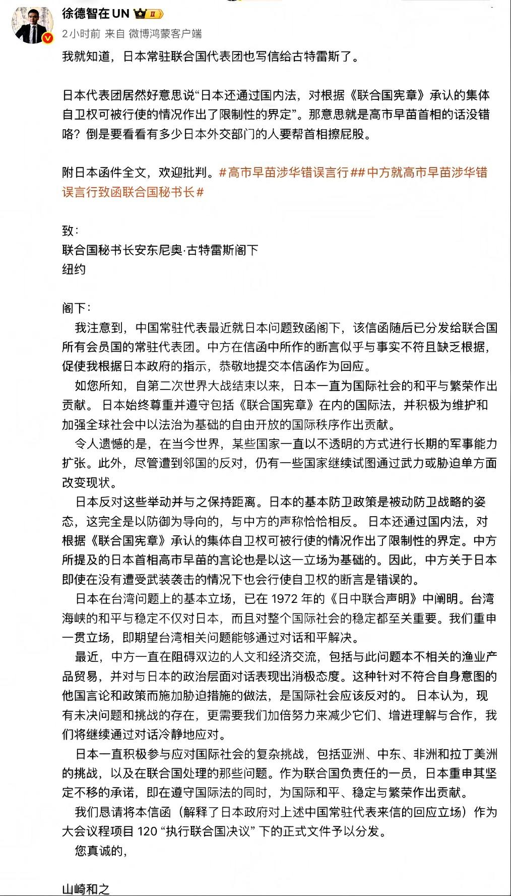 果不其然,在中方向联合国秘书长古特雷斯致函之后,日方也写了一份信,大概意思就是说中方“反应过度”了,说什么军事透明度,扯什么日本遵守了国际法之类。 “中方反应过度”?这是日本常驻联合国代表在致函古特雷斯时,用来回应中国严正立场的核心说辞。乍一听,仿佛自己才是被误解的一方,可细品之下,这话里透着一股熟悉的套路——不是反思错误,而是忙着给自己找台阶下。 高市早苗11月7日在国会那番话,把台海局势与日本“存亡危机事态”挂钩,等于变相将台湾纳入其集体自卫权的适用范围。这可不是随口一说的技术性表述,而是对一个中国原则的实质性挑战。更关键的是,日方事后不仅没撤回,反而通过外交渠道反复强调“符合国际法”“保持军事透明”,试图把政治挑衅包装成“合法合规”的常规操作。 央视记者徐得智将日方信件内容做了梳理,里面通篇没提“尊重中国主权”,却反复强调“日本的安全关切”。这种逻辑很奇怪:别人的内政,怎么就成了你的安全威胁?就好比邻居家里商量家务事,你非说这会影响你晚上睡不着觉,还要带人上门“维持秩序”——这合理吗? 我觉得,问题不在高市早苗一个人身上。从外务省到防卫省,从执政党到官僚体系,日方上下口径高度一致,说明这不是即兴发言,而是经过内部协调的战略表态。2022年新版《国家安全保障战略》把中国定为“前所未有的最大战略挑战”,2025年又加速部署远程打击能力,现在又在台海问题上主动“刷存在感”——这一连串动作,显然不是孤立事件。 过去几十年,中日关系之所以能磕磕绊绊往前走,靠的是双方对历史和现实的基本共识。比如1972年《中日联合声明》明确写入“台湾是中国领土不可分割的一部分”,1998年《中日联合宣言》重申“不干涉内政”。可如今,某些势力似乎觉得这些承诺已经过时,可以随意绕开甚至无视。 但中国的态度一直很清晰:台湾问题没有模糊空间,更没有讨价还价的余地。傅聪大使在致函中引用《联合国宪章》第五十一条关于自卫权的规定,不是在放狠话,而是在重申国际法赋予主权国家的正当权利。如果有人执意把和平对话的窗口关上,那后果只能由挑起事端的一方承担。 有意思的是,日方一边喊着“遵守国际法”,一边却对《开罗宣言》《波茨坦公告》这些战后国际秩序的基石文件避而不谈。这些文件明确规定将台湾归还中国,是国际社会普遍承认的事实。选择性适用国际法,本质上是对规则本身的破坏。 面对这种情况,我们确实需要调整心态。幻想对方会突然“讲道理”,不如扎实做好自己的事。中国的国防建设始终以防御为目的,东风系列导弹、航母编队、区域拒止能力,都是为了确保任何外部势力不敢轻易越线。这种底气,不是为了打仗,而是为了让和平更有分量。 朝鲜半岛局势、台海稳定、东海安全——这些议题看似分散,实则环环相扣。日本若真想成为“正常国家”,首先得学会尊重邻国的核心利益,而不是靠渲染威胁来获取军事扩张的借口。真正的安全,从来不是靠别人让步换来的,而是建立在相互尊重基础上的长期互信。 现在的问题是:当一方不断试探红线,另一方坚持底线思维,中间的缓冲地带正在快速消失。这时候,清醒比热情更重要,准备比口号更管用。 各位读者你们怎么看?欢迎在评论区讨论。