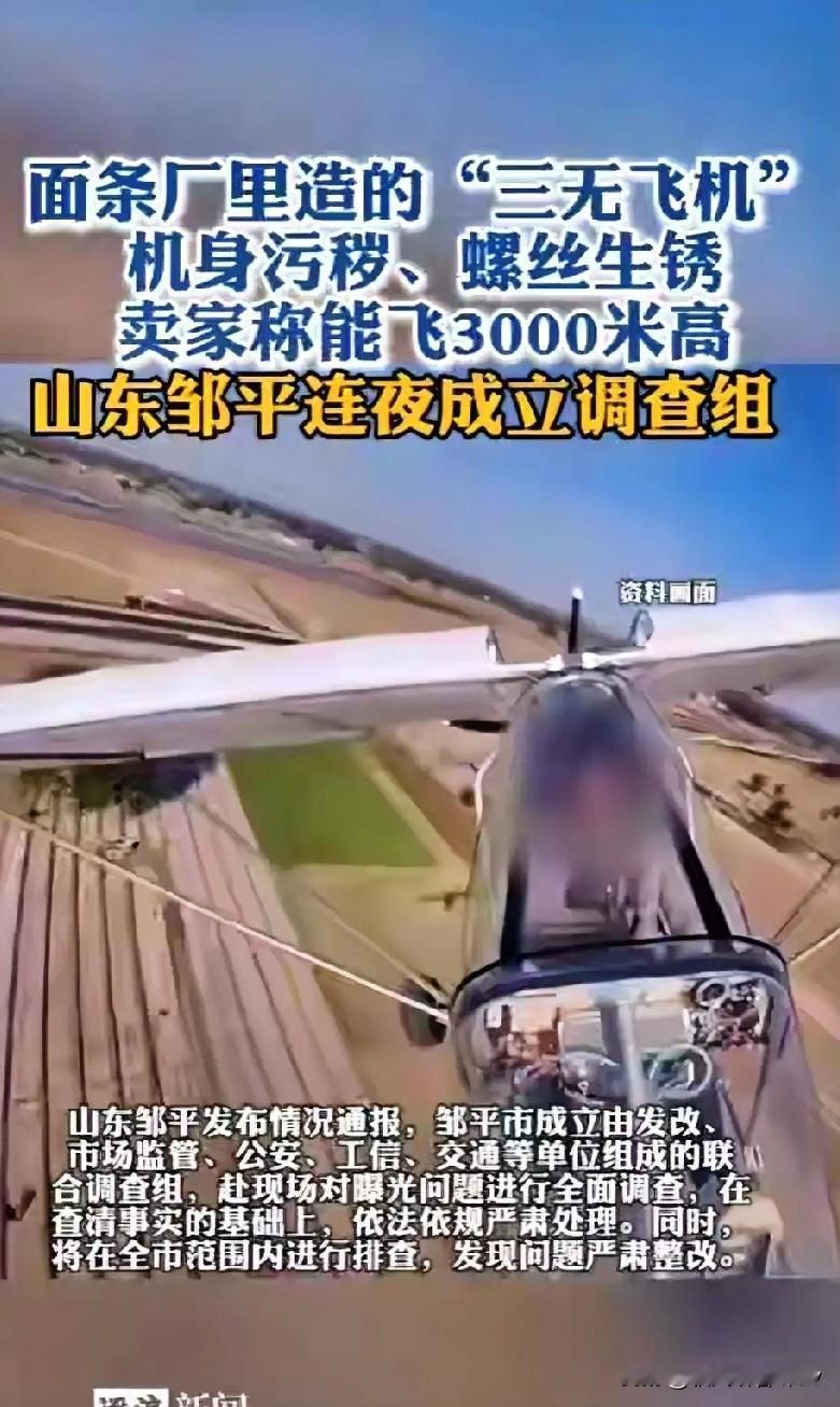 11月23日央视曝光山东邹平一家面条厂,本想反面教材警示“三无飞机”的违规危害,没想到评论区彻底跑偏成大型点赞现场。 车间里堆着整齐面条,角落藏着3架组装中的旋翼飞机,老板老周用面条机通用机床,拉上几人就做起定制飞机生意,全程无任何合法资质。 飞机机身污秽、螺丝生锈,零件用四年陈品甚至二手货,试飞场地是农田道路,老周无飞行执照仍敢调试,售价从8万到数十万元不等。 四川、河北等地卖家形成隐秘产业链,靠“配件套材”“只供展示”的阴阳合同逃避监管,今年9月已有四川男子驾同类飞机直播坠亡。 网友满眼都是“山东工业硬核”,却忽略其背后的公共安全隐患。民间创新值得肯定,但该守住法律底线吗?你觉得该严管还是规范引导?