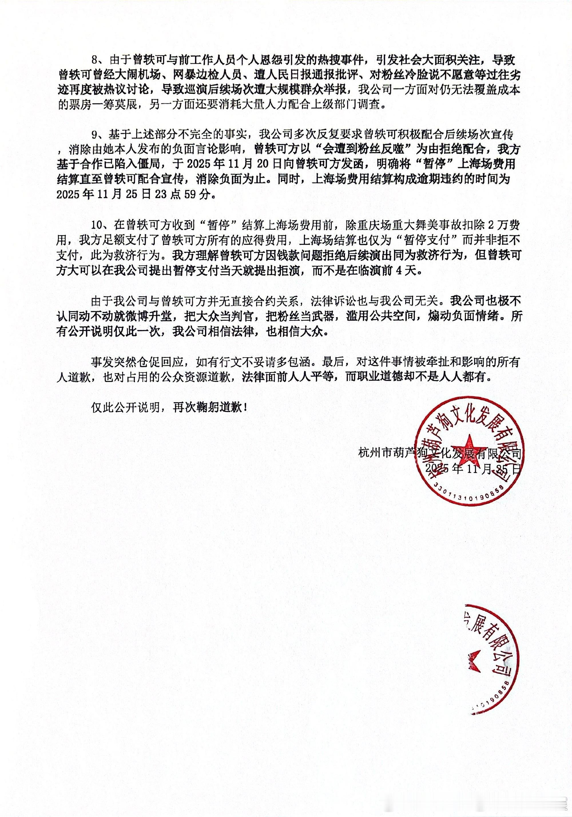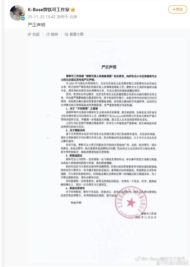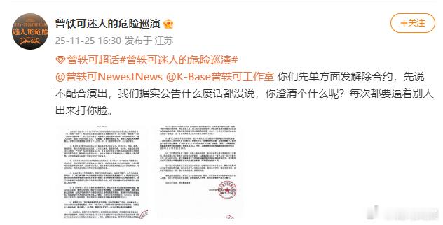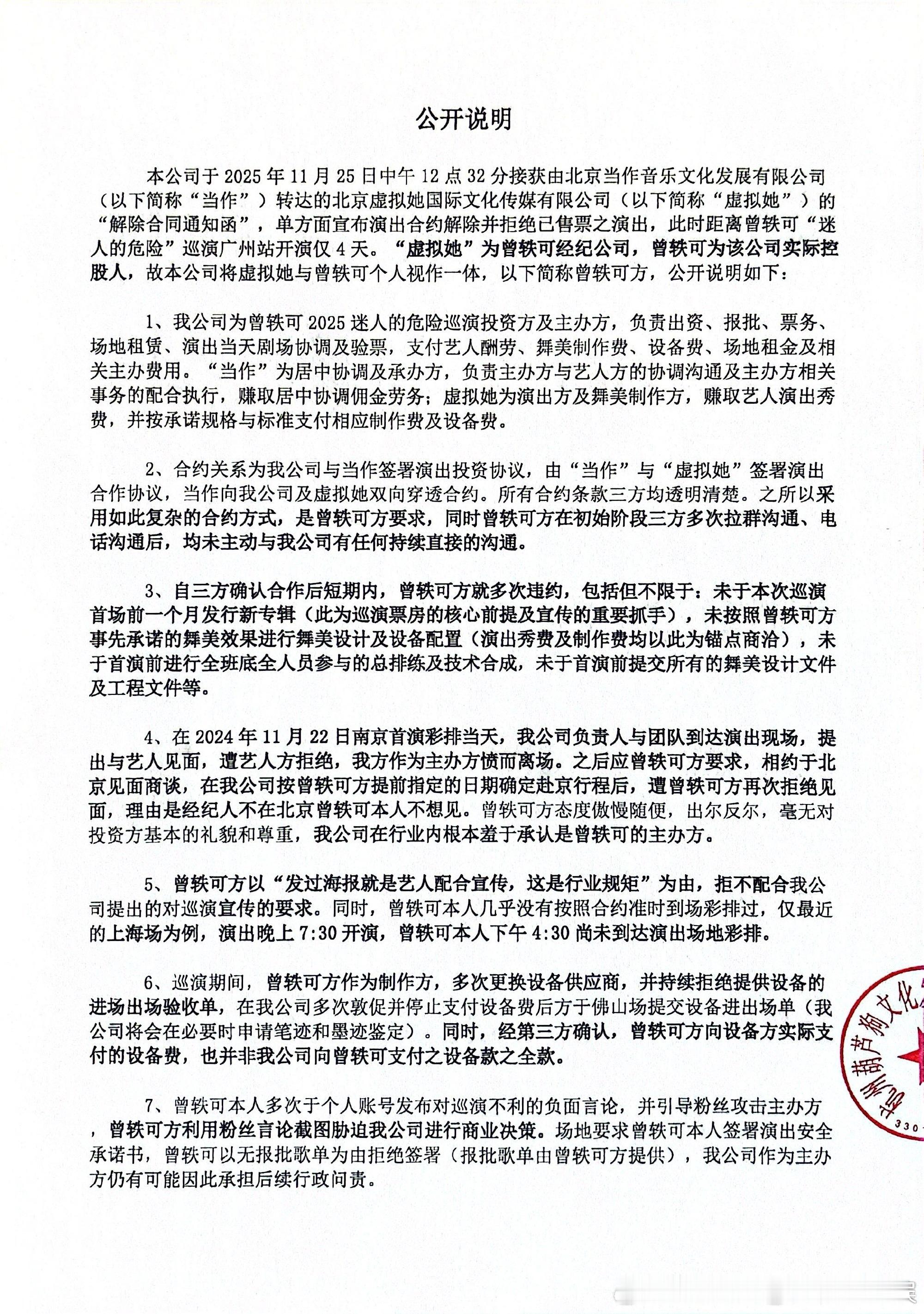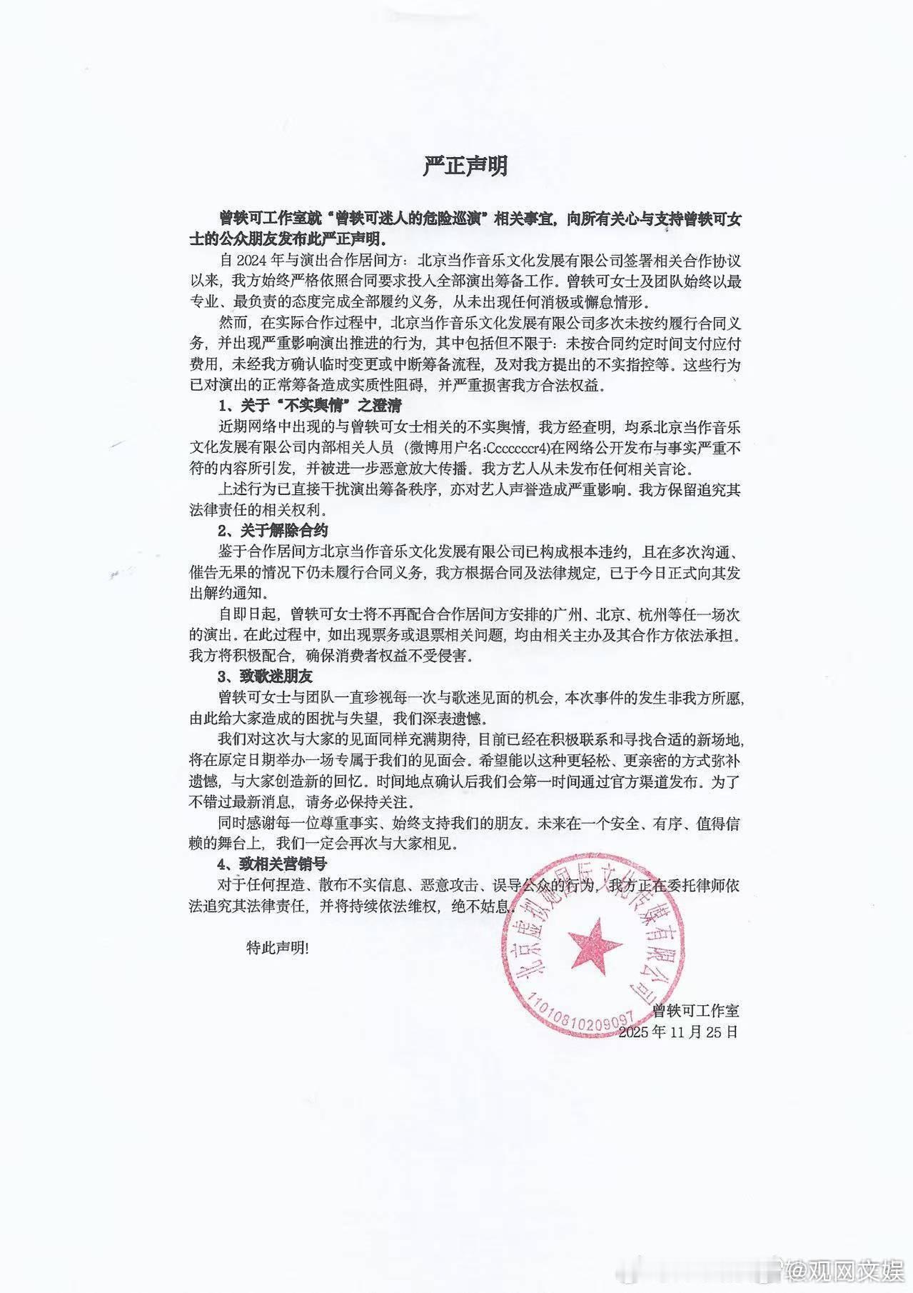 11月25日, 主办方发文称曾轶可方单方面提出解除协议并明确拒绝配合演出,广州站与北京站演出将无限期延期。 对此,曾轶可工作室 发布严正声明,声明称曾轶可及团队始终按约完成演出筹备,但对方多次未履行合同义务,包括未按时支付费用、临时变更筹备流程、捏造不实信息等,已严重阻碍演出推进并损害其合法权益。针对近期网络不实舆情,工作室澄清称,相关内容系合作方内部人员发布并恶意传播,曾轶可本人从未发布相关言论,工作室保留追究法律责任的权利。同时,工作室宣布已正式向合作方发出解约通知,自即日起曾轶可不配合对方安排的广州、北京、杭州等场次演出,票务及退票问题由相关主办方承担,工作室将积极配合保障消费者权益。随后曾轶可巡演主办方也发布公开声明称,“你们先单方面发解除合约,先说不配合演出,我们据实公告什么废话都没说,你澄清个什么呢?每次都要逼着别人出来打你脸。 ”主办方表示,自三方确认合作后短期内,曾轶可方就多次违约,主办方团队要求与艺人见面也被再三推脱,且曾轶可拒不配合公司巡演宣传,在巡演期间多次更换设备供应商并拒绝提供设备的进场出场验收单等主办方称,曾轶可之前的负面热搜事件导致巡演后续场次遭大规模举报,公司一方面对无法覆盖成本的票房一筹莫展,另一方面还要消耗大量人力配合上级部门调查。最后表示公司与曾轶可并无直接合约关系,公司也不认同微博升堂,所以公开说明仅此一次。