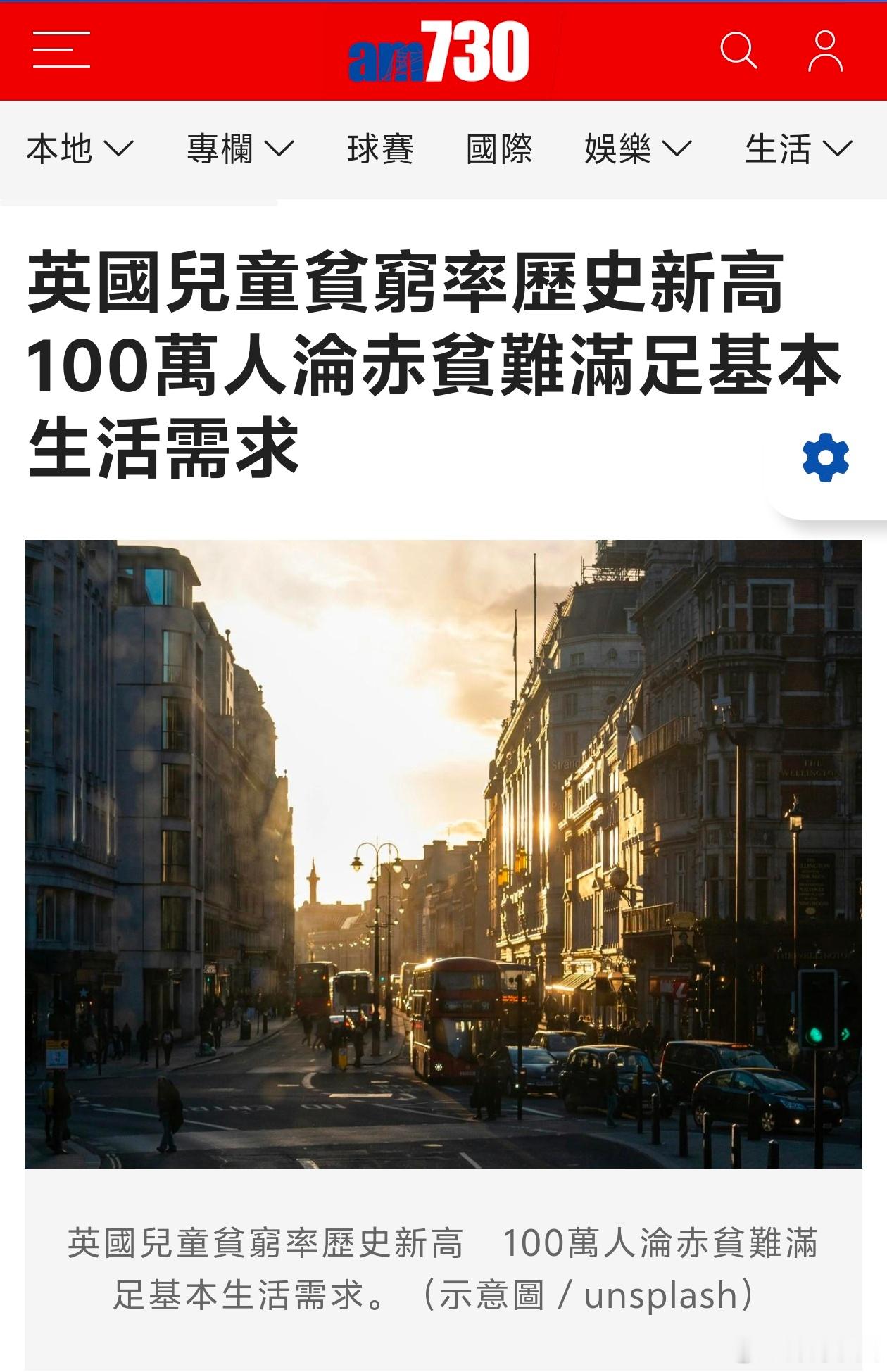 英国儿童贫穷率历史新高 100万人沦赤贫难满足基本生活需求《CNN》11月24日报道,由于英国生活成本飙升,加上多年来政府的财政紧缩政策导致社会保障体系崩溃,英国的儿童贫穷率已达到历史新高。英国政府4月发布的一份报告显示,英国约有三分之一的儿童——约450万人——生活在相对贫困之中。通常,贫穷的定义是家庭收入低于全国中位数收入(扣除居住成本后)的60%。根据约瑟夫朗特里基金会2023年的研究显示,其中100万名儿童处于赤贫,连最基本的生活需求──保暖、干燥、衣食──都无法满足。该基金会致力于研究贫困问题并制定相关政策以应对贫困。据报导,即使是收入远高于贫穷线的家庭,居住和托儿费用,尤其是在伦敦,也可能高得惊人,以至于根本没有钱用于其他任何方面。约有70%生活在贫困中的儿童至少有一位家长在工作,显示工作已不再能提供财务保障。