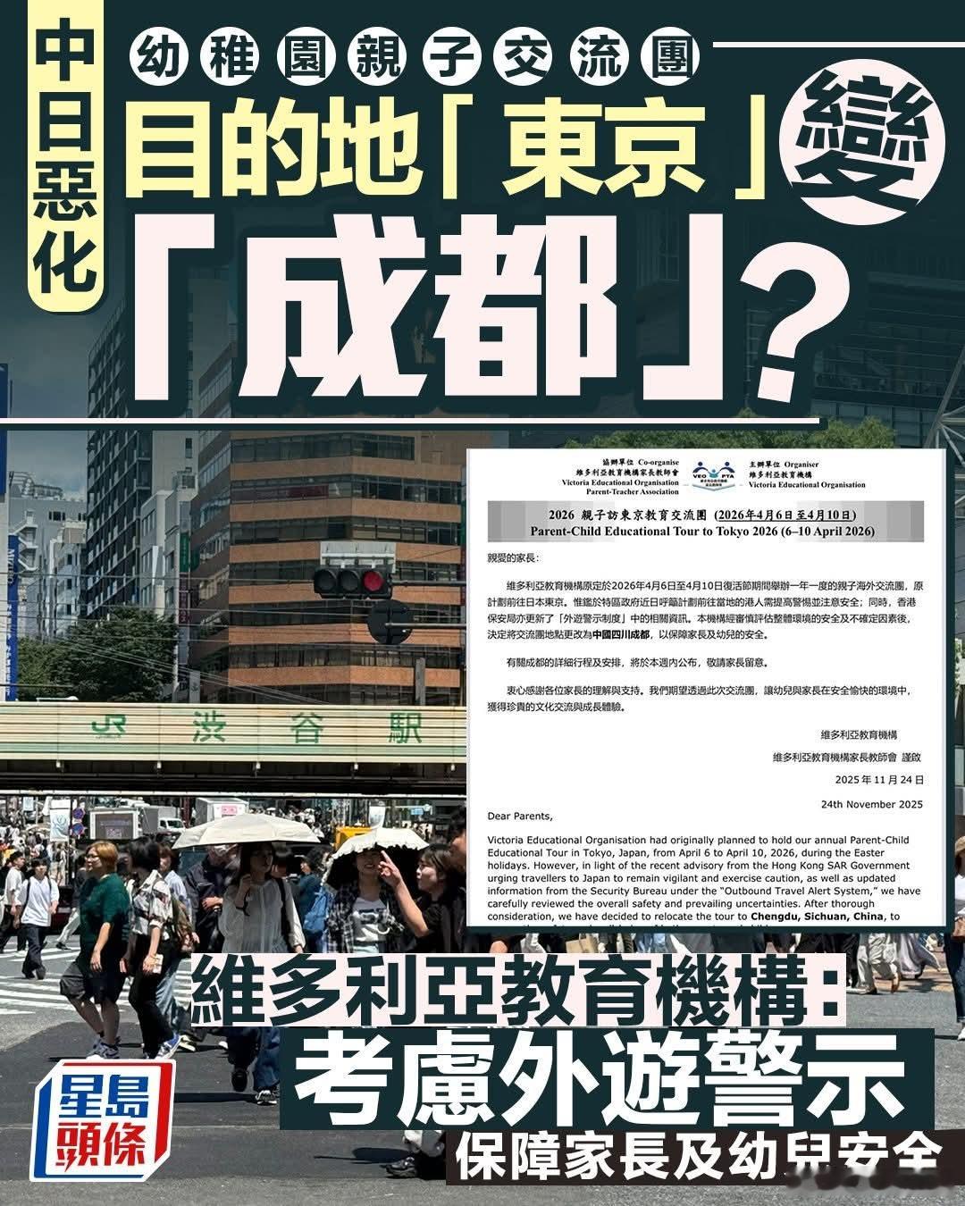香港幼儿教育机构取消赴日交流改去成都中日关系恶化之际,继香港教育局日前表示香港代表团将退出今年的「21世纪东亚青少年大交流计划」,日本共同社昨(24日)引述消息指,香港政府开始停止与日本驻港总领事馆官方交流。情况再蔓延,有幼儿园将原定前往东京的亲子交流团,更改目的地至四川成都。网上传出一张维多利亚教育机构有关「2026亲子访东京教育交流团」通告,内容为机构宣布原定明年复活节假期期间(2026年4月6至10日)举办的亲子海外交流团,原计划前往日本东京,目的地将更改为四川成都。通告表示,鉴于特区政府近日呼吁前往当地的港人需提高警觉并注意安全;同时,香港保安局亦更新了「外游警示制度」中的相关资讯。机构经审慎评估整体环境的安全及不确定因素后,决定将交流团地点更改为四川成都,以保障家长及幼儿安全,亦将于本周内公布成都交流团的详细安排。机构又说,期望透过此次交流团,让幼儿与家长在安全愉快的环境中,获得珍贵的文化交流与成长体验。