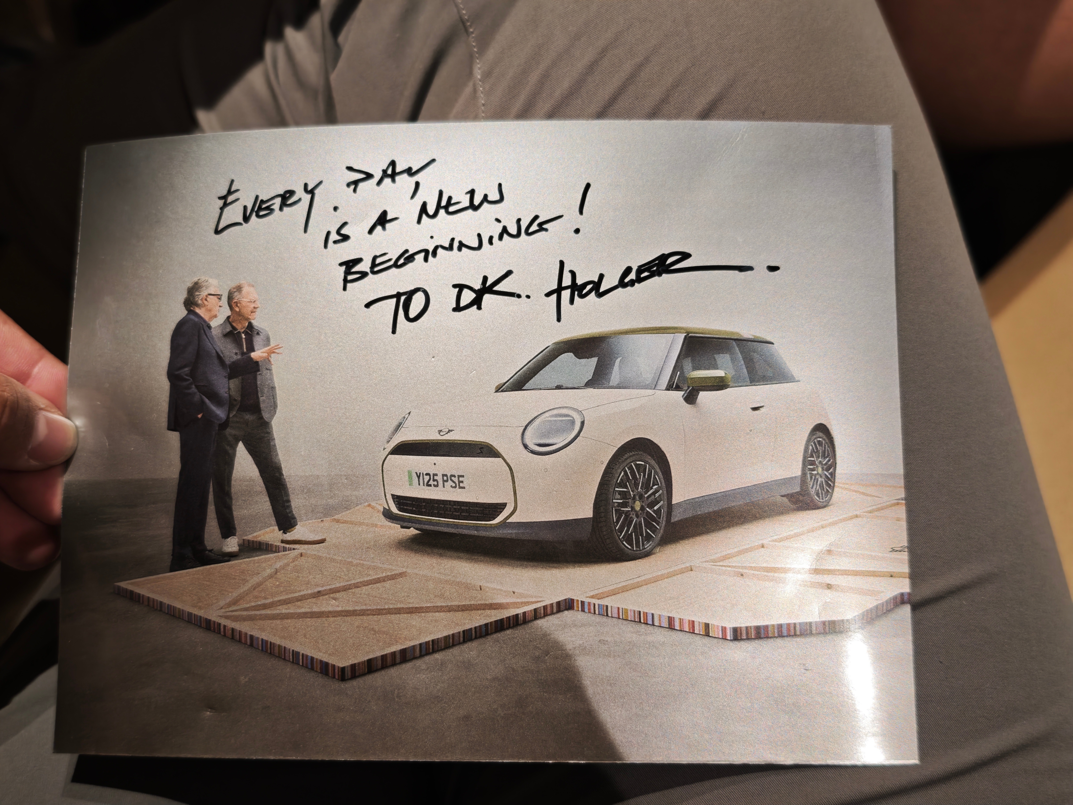 老陈的线下真实前两天还在微博上说“看不太懂新的MINI Paul Smith版”,因为老的实在太经典了,大呼“是我不懂审美”然后,然后第二天就见到了设计老总Holger Hampf,还送我一张签名照 聊了之前慕尼黑车展看到的印象深刻的MINI X DEUS EX MACHINA(图2)我赶紧叠甲——我超喜欢MINI我超喜欢MINI我超喜欢MINI的!Every day is a new beginning!