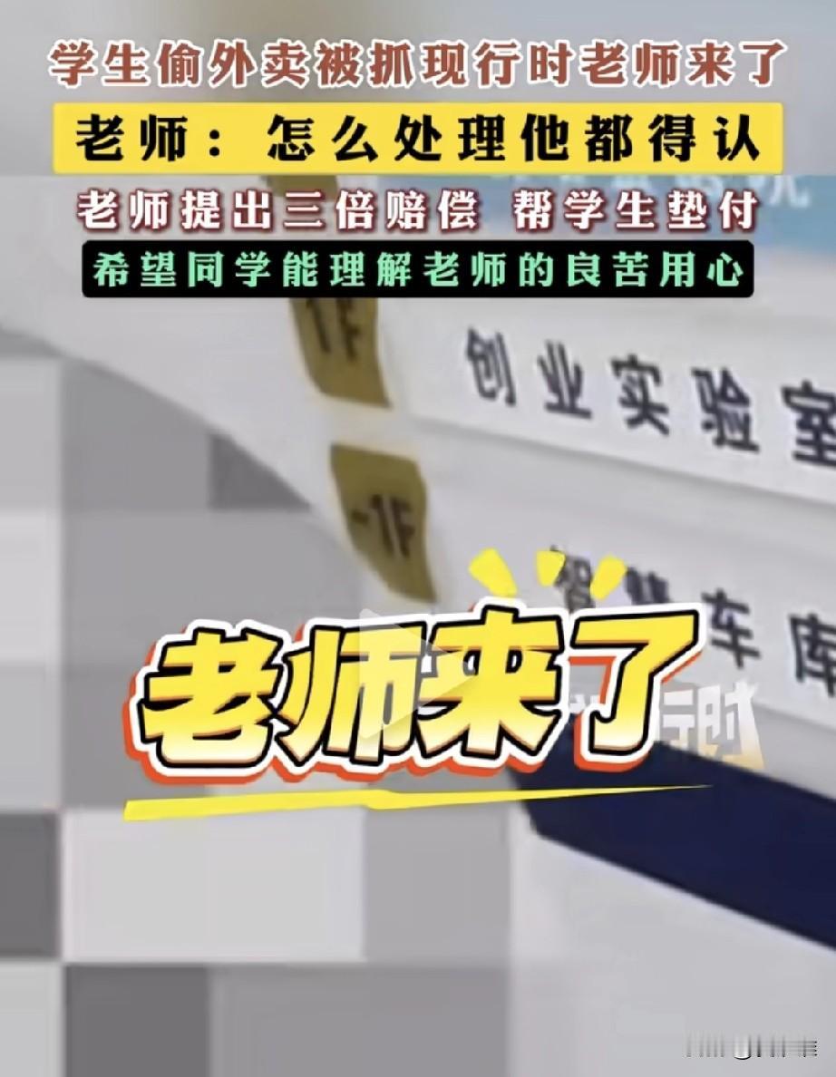“用心良苦。”男子在大学开了个超市,学生们点的外卖都是暂时放在他这里,等过会来取,可是最近老是有丢失外卖的情况,为了抓住这个贼,老板开始留心起来,并安装了摄像头,晚上的时候终于有个学生被他抓住了现行,这时候来买东西的老师正好遇到这是自己的学生,对老板说:“怎么处理他都不为过,他都得认,但是念在他是个学生的份上放他一马。”随后,老师又对老板提出可以三倍赔偿,并且当场掏出了钱要为学生垫付。老板对这位偷外卖的同学说,希望你能够理解老师的用心良苦! 我想说,学生能够遇到这样的好老师,实在是难得。