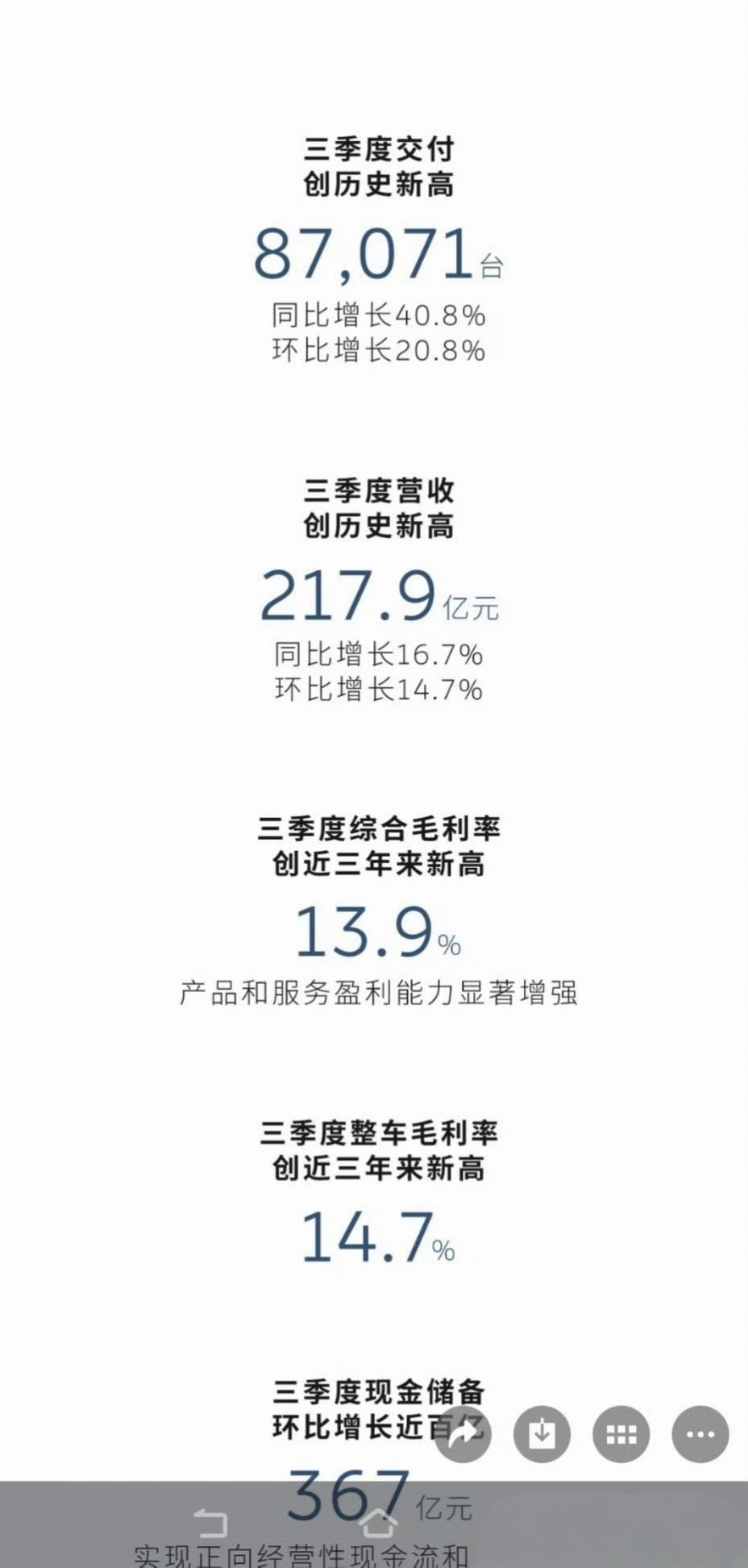 蔚来发布2025年三季度财报: ✔三季度交付87,071台,同比增长40.8%。 ✔三季度营收217.9亿元,同比增长16.7%,。 ✔三季度综合毛利率13.9%,三季度整车毛利率14.7%,创近三年新高。 ✔三季度现金储备367亿,还很有钱! 斌哥今年的目标是四季度盈利,目前毛利13.9%,一般认为达到20%毛利就可以盈利了,蔚来还得努努力。【来自懂车帝车友圈】