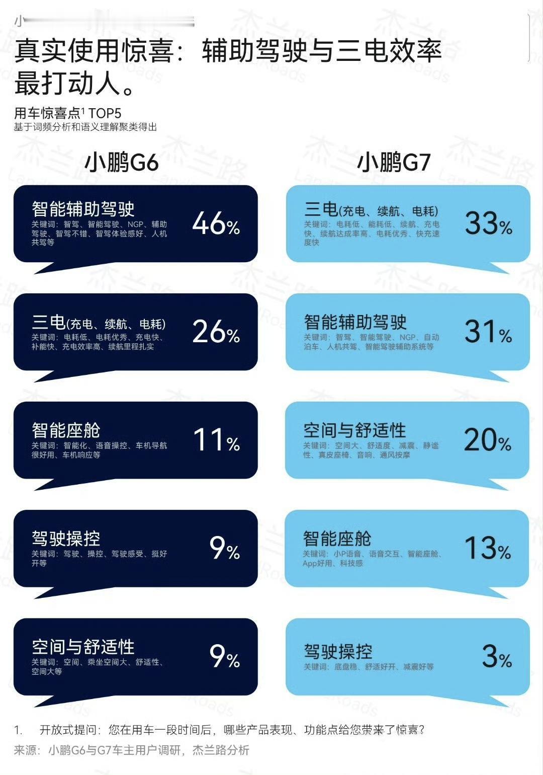 新三大件成新智家庭购车要因 油车的三大件是发动机,变速箱,底盘。买油车的人也最在意这三项,那你觉得电车的三大件是啥? 我的三个选项是: 三电,智驾,座舱。 三电,毋庸置疑电池电机是最重要的,续航长短是买车第一因素。 智驾,排第二不过分,现在买个电车不智能,总觉得还不如买油车呢。 座舱,包括空间和座舱的交互,必须要有大的中控屏,语音交互和车机UI影响用车体验。 也可以参考《杰兰路》发布的小鹏G6和G7买车报告,目前“新智家庭”买车标准就是: “好用的智能驾驶辅助、高效稳定的三电、舒适大空间”。 这跟我认为的是差不多的。 小鹏G6和G7,的核心卖点也是: 电池续航长,能耗低续航达成率高,有高阶智驾,有天玑座舱,以及后排空间大。 这两款车已经是20万级别纯电SUV绕不开的选择了。【来自懂车帝车友圈】
