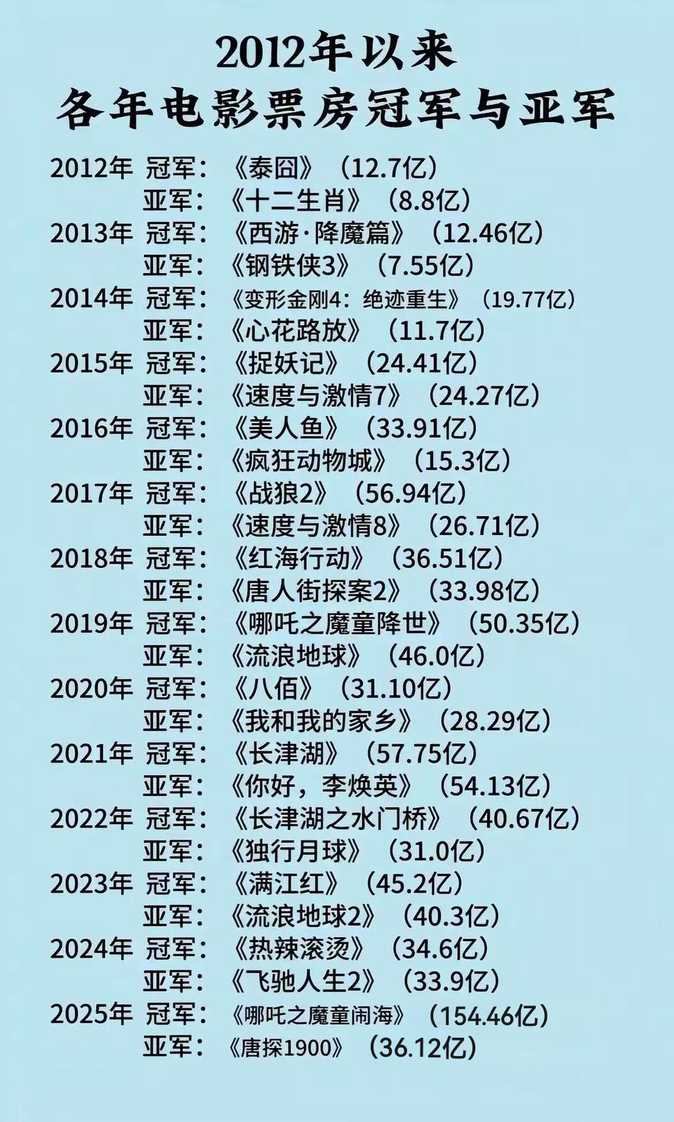 2012年以来历年电影票房冠军和亚军,你们觉得哪年的电影票房亚军输给冠军是最冤的? 可以发现在2015年之前,国产电影票房最高不超过15亿,从2015年开始,国产电影票房大爆发,年度票房冠军《捉妖记》拿到了24.41亿票房,力压好莱坞电影《速度与激情7》。 在2017年年度票房冠军《战狼2》拿到56.94亿票房,将国产电影票房带到了新的高度,不过票房亚军依然是好莱坞电影。 而从2018年开始,国产电影开始霸占了年度票房冠军和亚军的席位,直到2025年依然没有改变。 在2021年,年度票房冠军和年度票房亚军同时拿到50亿以上的票房,其中票房冠军《长津湖》拿到57.75亿票房。 而今年《哪吒之魔童闹海》更是突破历史,拿到了154.46亿票房,将电影票房又带到了一个新的高度。 我个人觉得2023年票房亚军还是挺可惜的,《流浪地球2》当时的热度非常大,结果最终票房不敌《满江红》,最终只拿到了年度票房亚军。