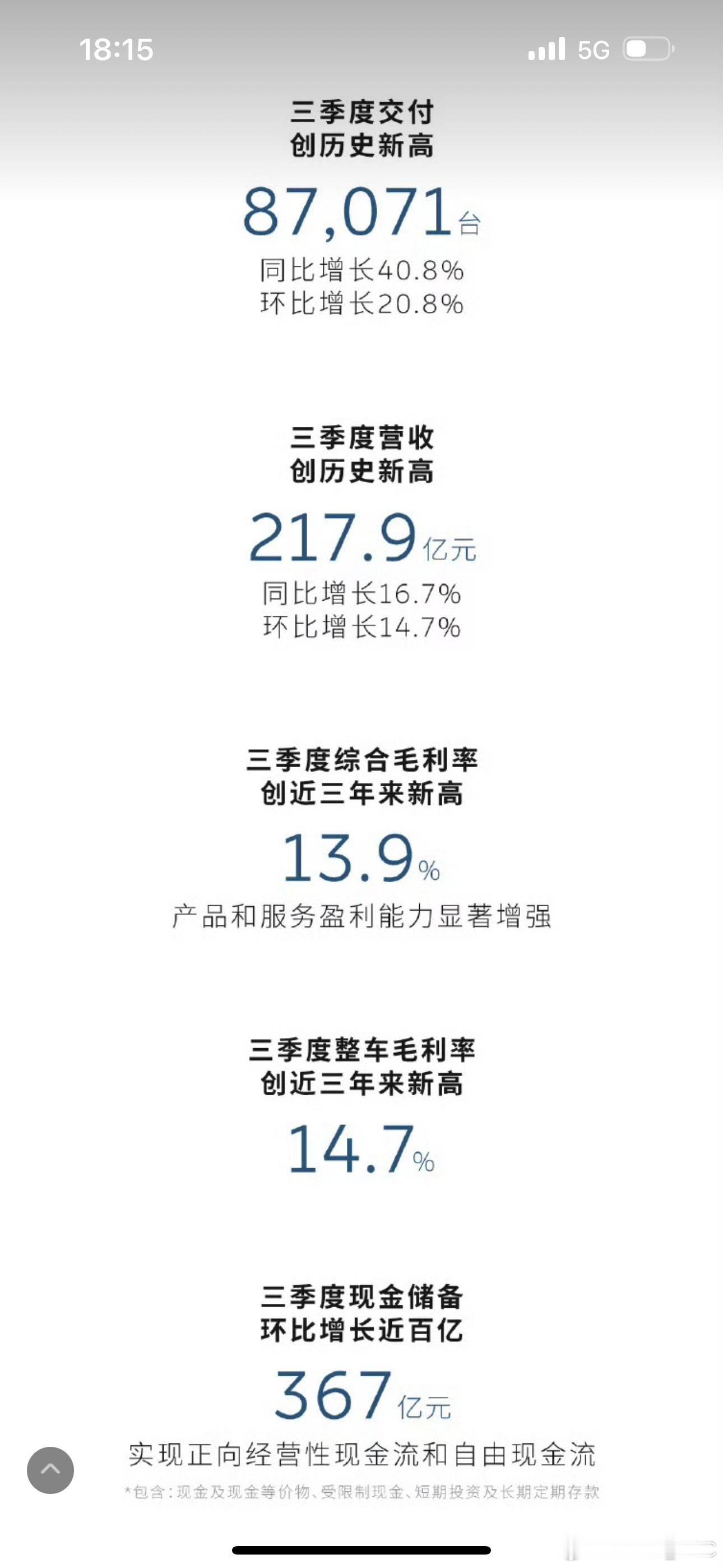 【蔚来 Q3 财报】- 营收 217.9 亿元,同比增长 16.7%。- 整车毛利率 14.7%,在行业里不算顶尖,但这是蔚来近三年来的季度最高。- 现金储备来到 367 亿元,单季增加近 100 亿。这是一个关键信号:蔚来正在从亏损扩张,走向了正常的经营轨道。