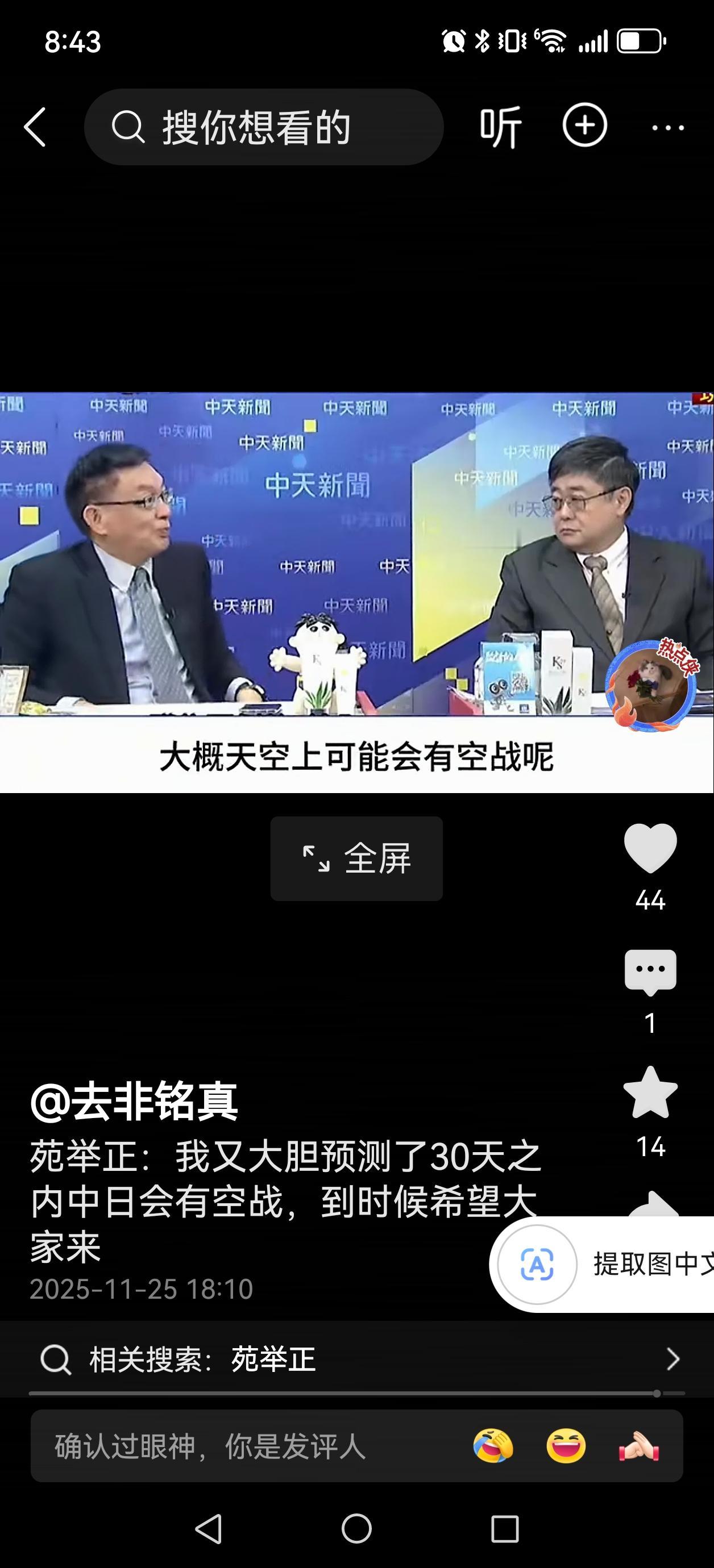 30日内可能会有空战? 曾经精准预测印巴空战的台湾省苑举正教授,经过综合分析后,再次做出预测,中倭在30日内可能会有空战冲突。 大家觉得有没有可能呢? 高市早苗拿台湾问题冒险有哪些企图