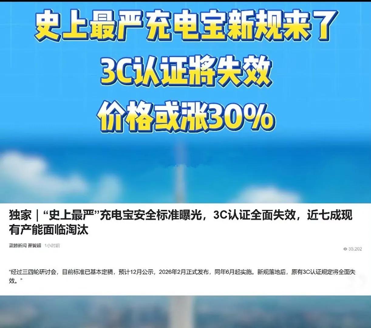 充电宝涨价! 充电宝最严新规要来了,原有3C认证将全面失效 ,大概七成现有产能面临淘汰,新规明年6月实行。 其实挺好的 ,毕竟涉及安全 ,企业产品不规范只能国家定了。 就是我这今年才换的 明年又得重新买了!