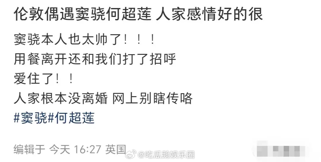 有网友在伦敦偶遇窦骁何超莲,两口子吃饭有说有笑,他还耐心等着老婆化妆!看上去不像