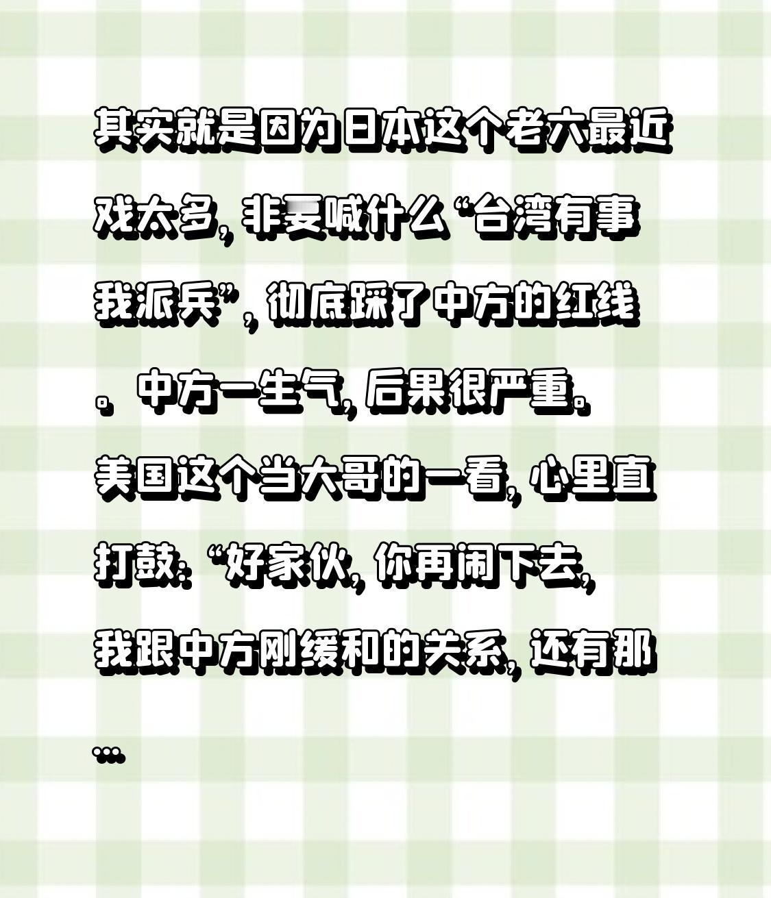 其实就是因为小日子这个老六最近戏太多,非要喊什么“湾湾有事我派兵”,彻底踩了龙哥的红线。龙哥一生气,后果很严重。大漂亮这个当大哥的一看,心里直打鼓:“好家伙,你再闹下去,我跟龙哥刚缓和的关系,还有那等着谈的大生意,非得让你搅黄了不可!” 所以赶紧出来管管,别让小弟玩火,烧了自家房子。