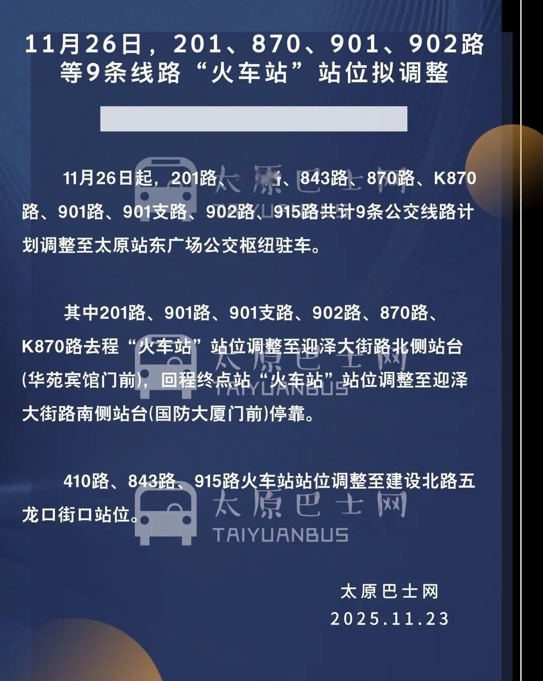 山西太原,经常选择从五一东街乘坐公交车的乘客请注意:从11月26日起,201、870、901、902等九条公交车调整了上车地点(见下图)。请大家相互转告,以免耽误您的行程。公交服务热线:7249876