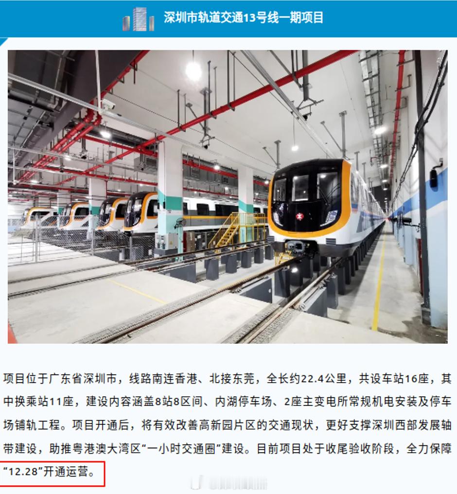 深圳地铁13号线最新消息是,20号载客试运行,28号正式开通。
