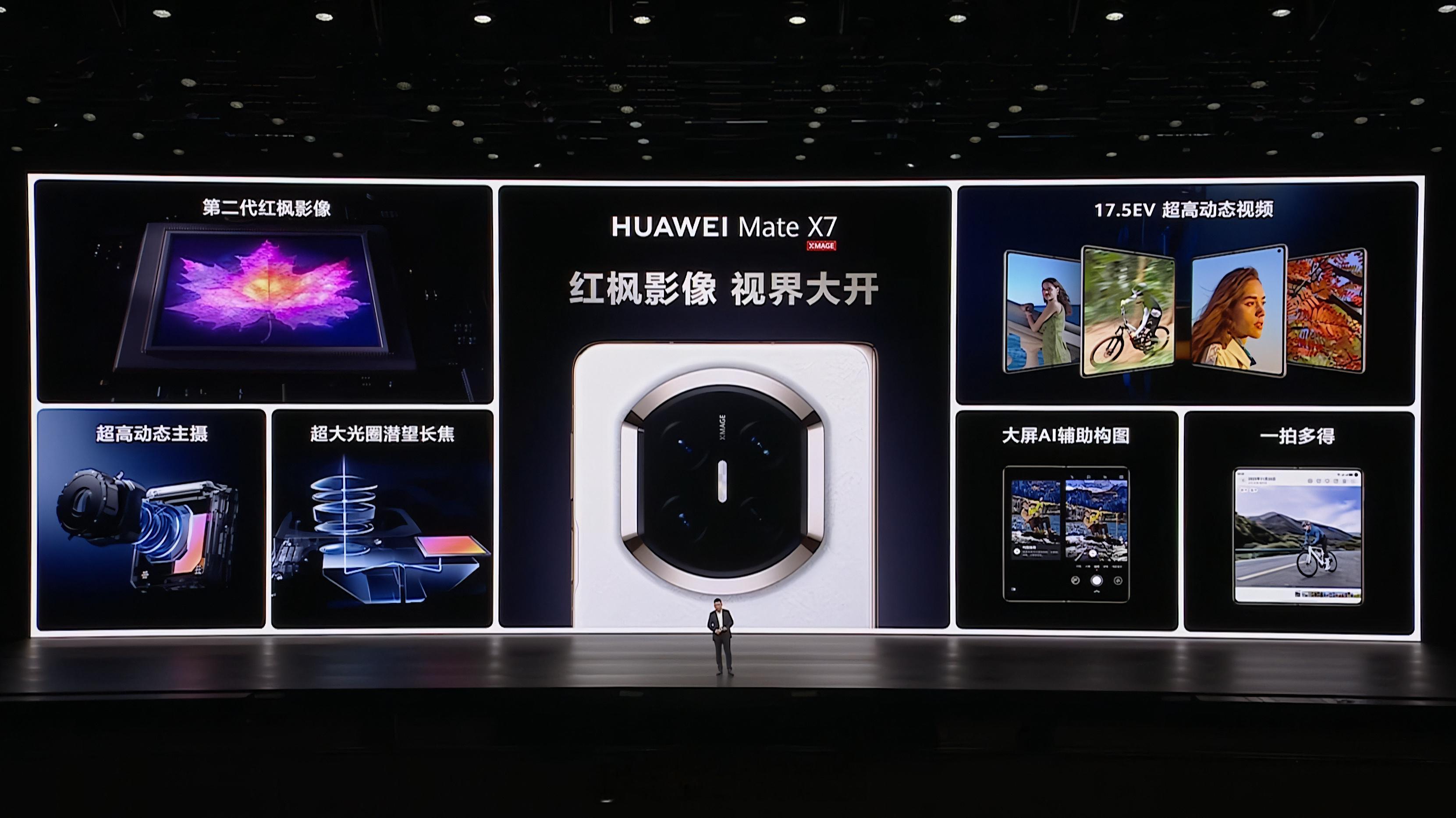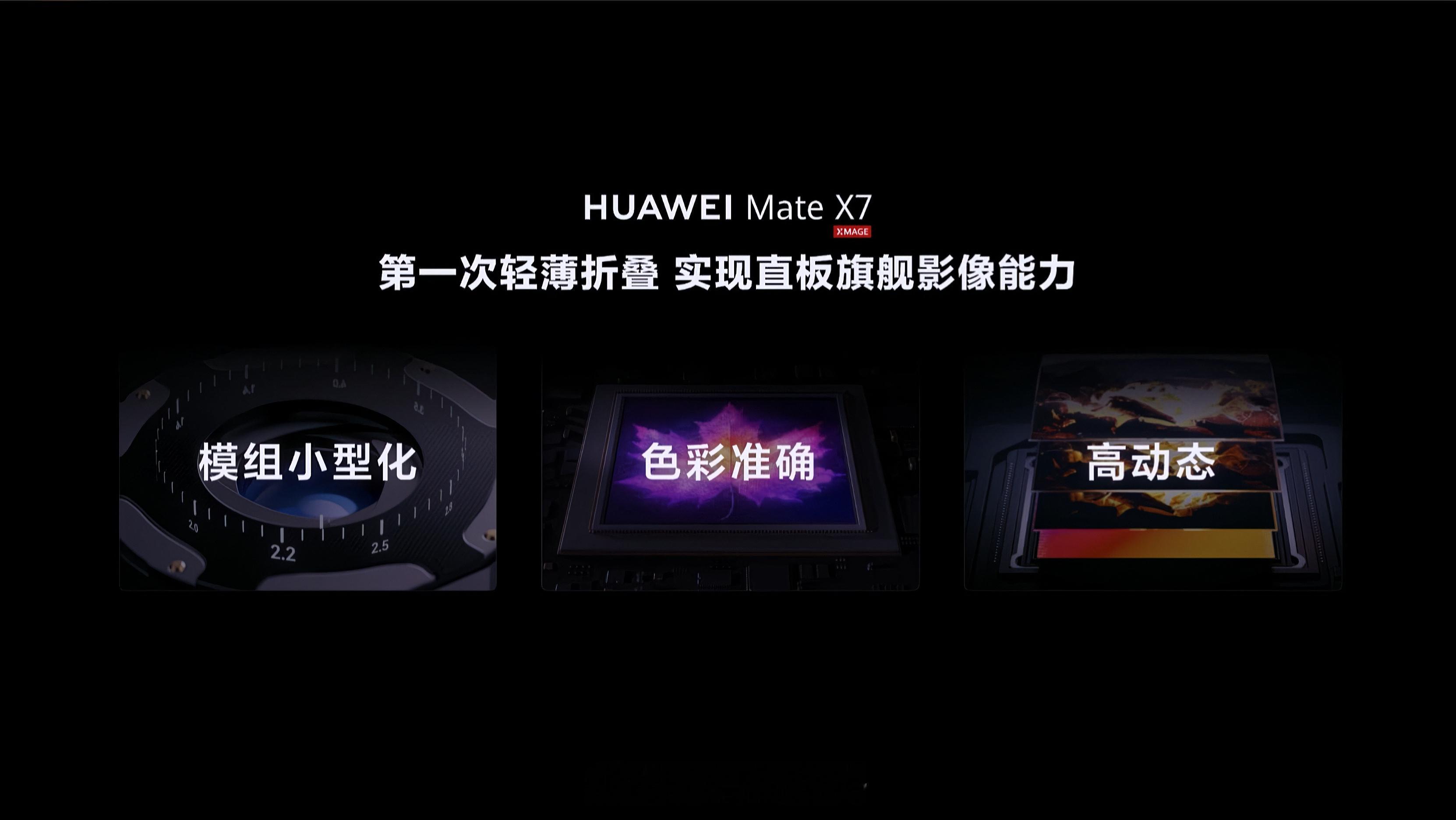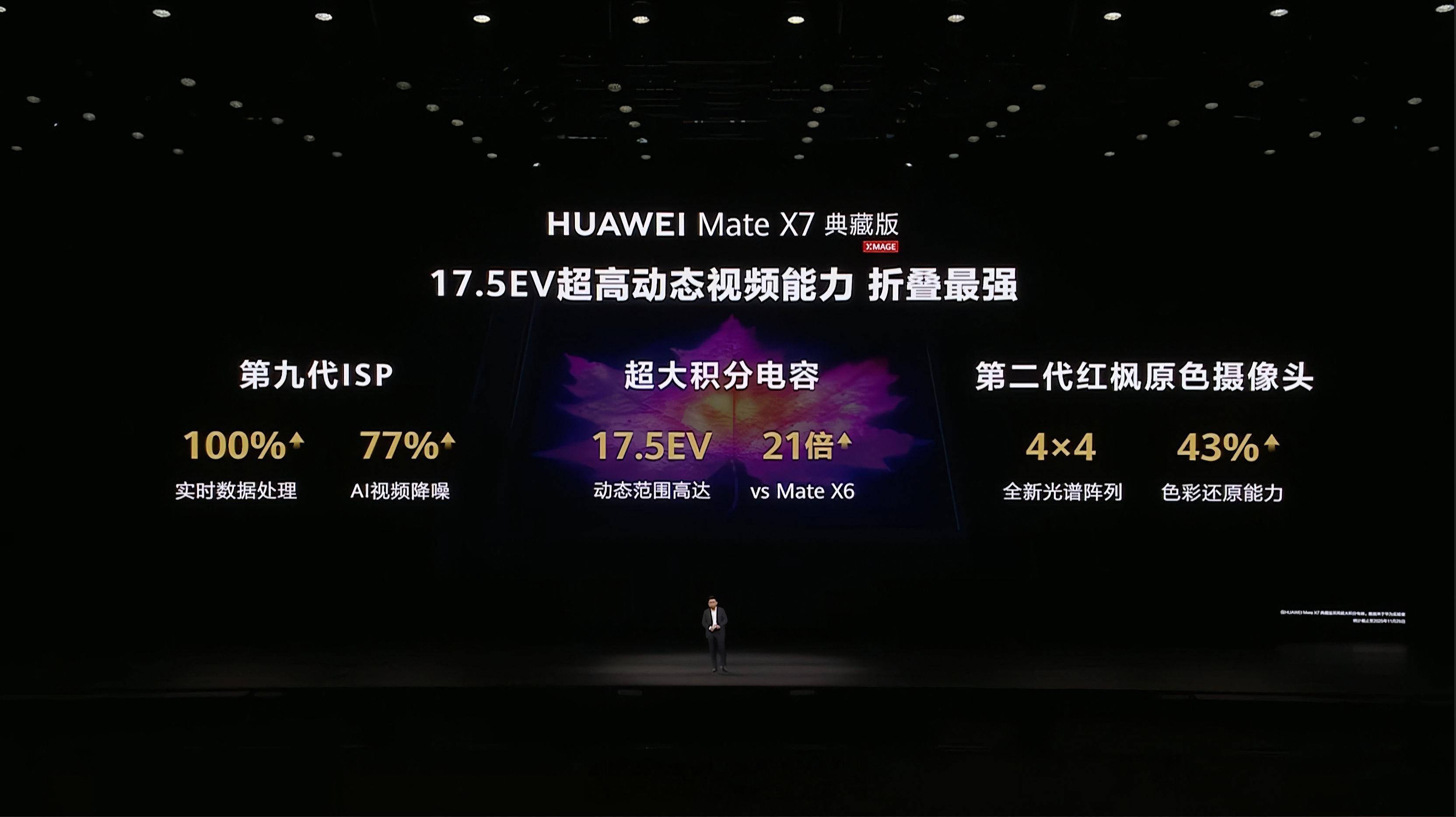 华为Mate X7折叠屏挑战直板机的影像体验,全新定制模组,17.5EV超高动态范围的主摄,第二代红枫摄像头,3.5倍光学并支持微距的长焦,40MP RYYB传感器超广角。