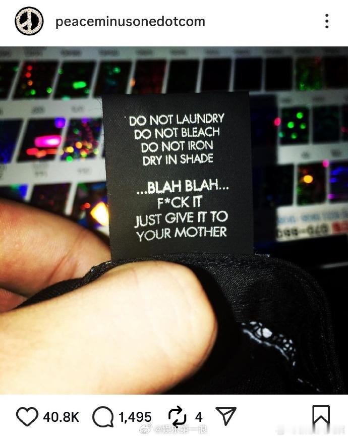 网友扒出权志龙此前品牌的衣标内容:“不要水洗、不要漂白、不要熨烫、阴干什么什么的……f*ck it直接给你妈就行了。”