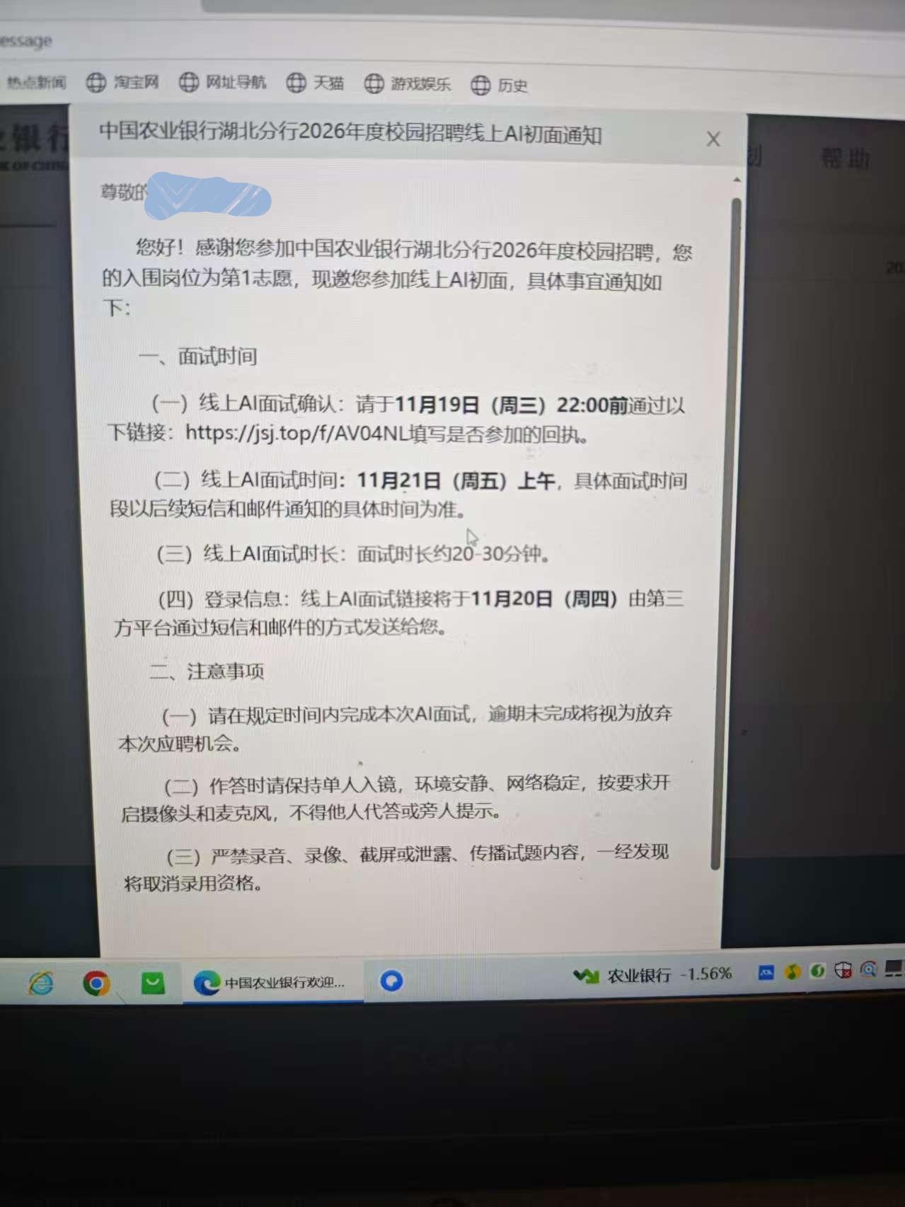 几大银行秋招火热进行中,你接到农业银行的面试通知吗?银行秋招校招 银行秋招聘 农行面试 11月21日线上AI初试(右图)。12月1日至12月4日线下面试通知(左图)