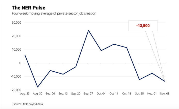 先看一下持续走软的就业数据。薪资处理公司ADP周二报告称,在截至11月8日的四周内,私营部门雇主平均每周减少13,500个就业岗位。由于非农缺席,ADP近期开始公布这些估算数据。该数据有两周的滞后时间,提供美国就业变化的四周移动均值。